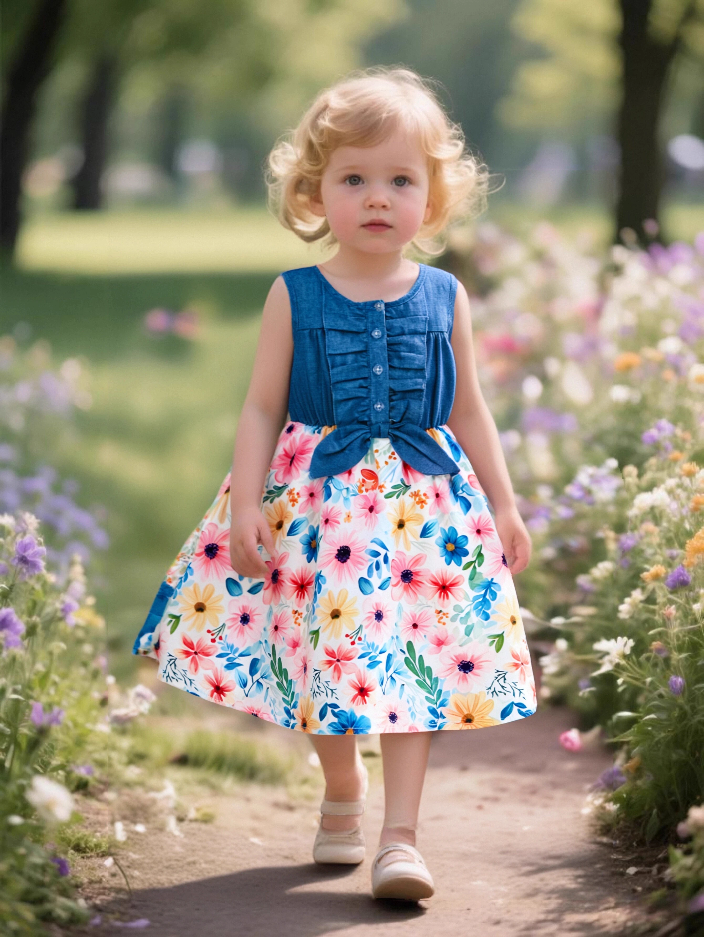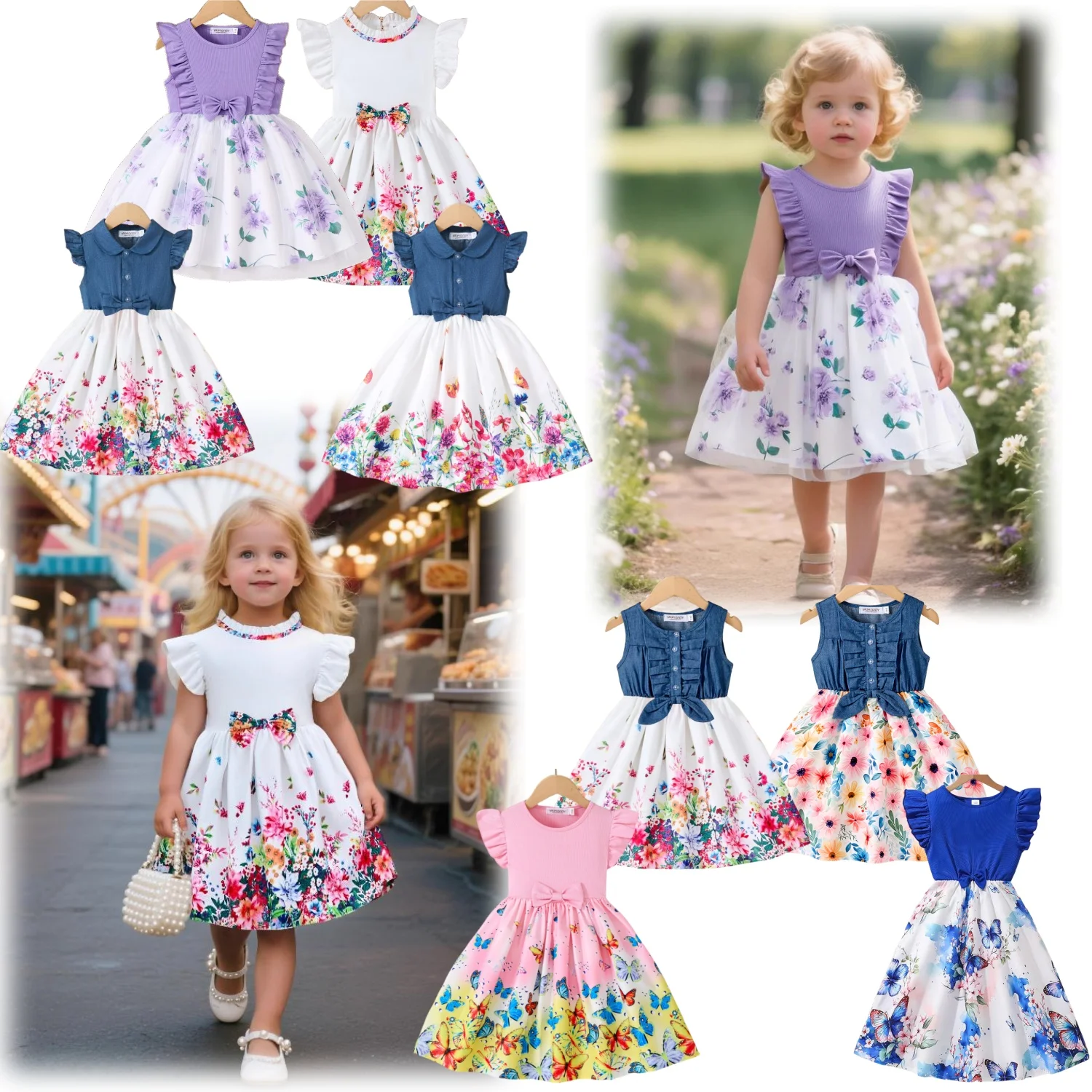 Girls Kids Denim Splicing Butterfly Flower Print Dress 6-10 Aged Girls Summer Comfortable Skirt Dai...