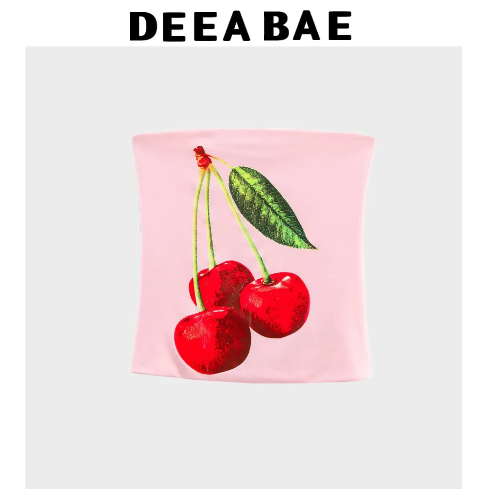 2025 Summer New Sweet And Fashionable Slim Fit Cherry Print Straight Neck Strapless Tank Top