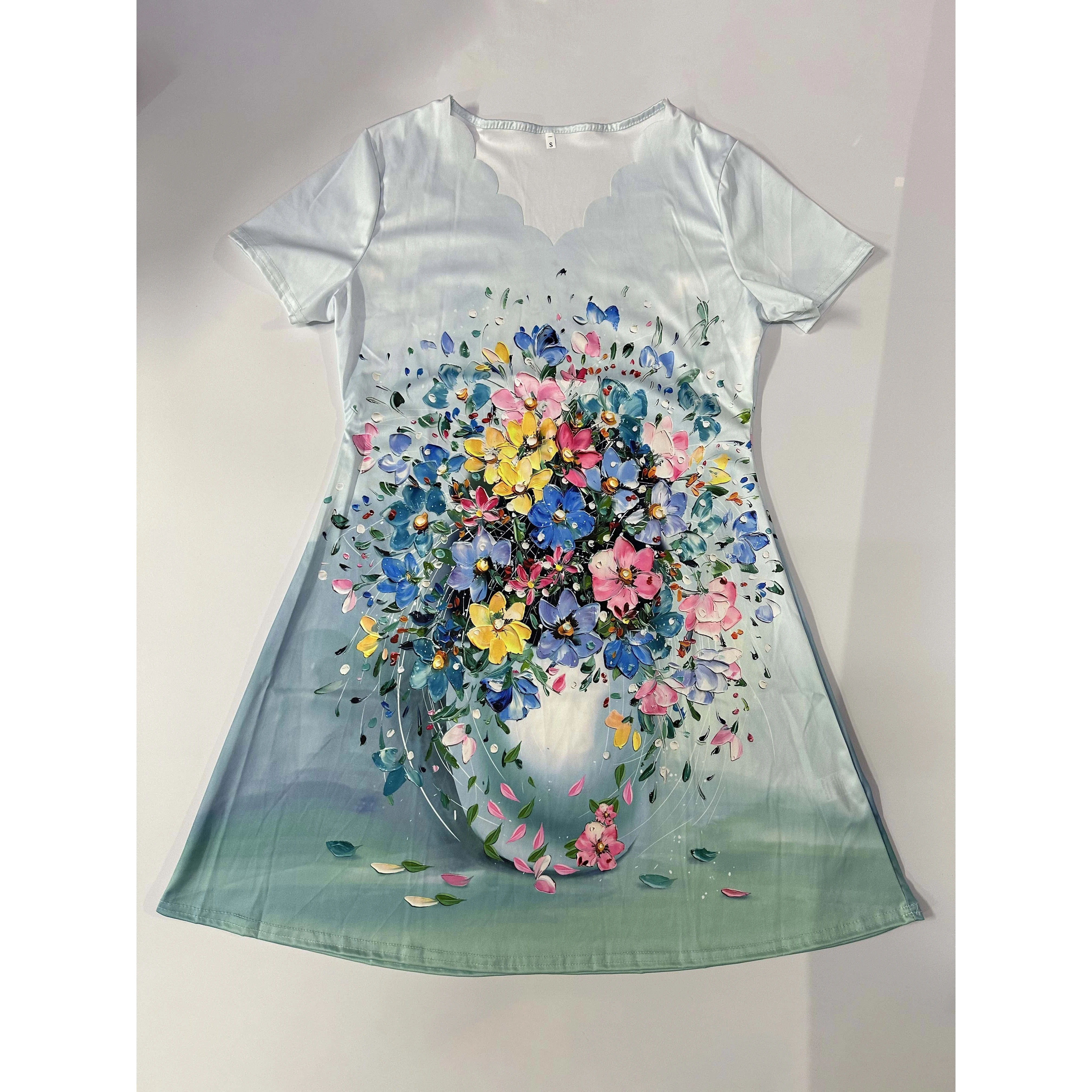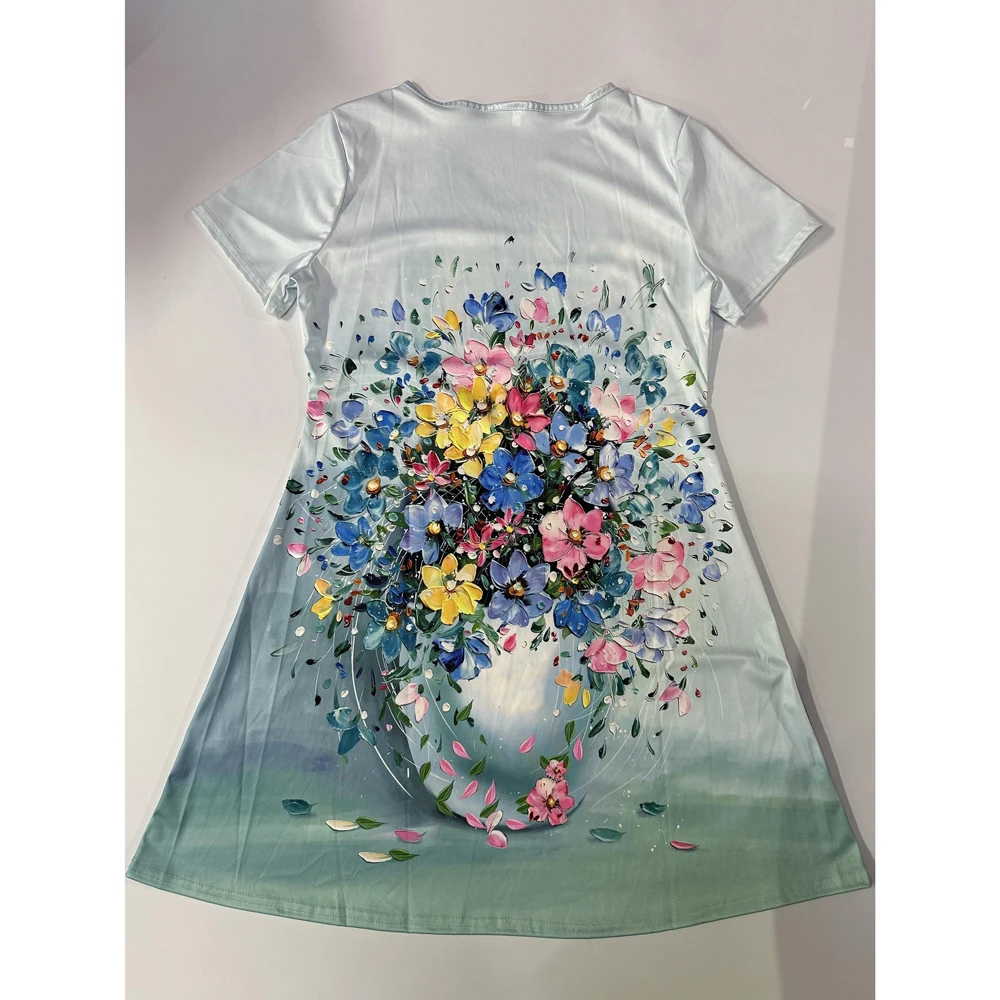 3D Flower Print New Casual Short Sleeve Long Dress Women's V-Neck Printed Dress Swing Bohemian Retro Dresses