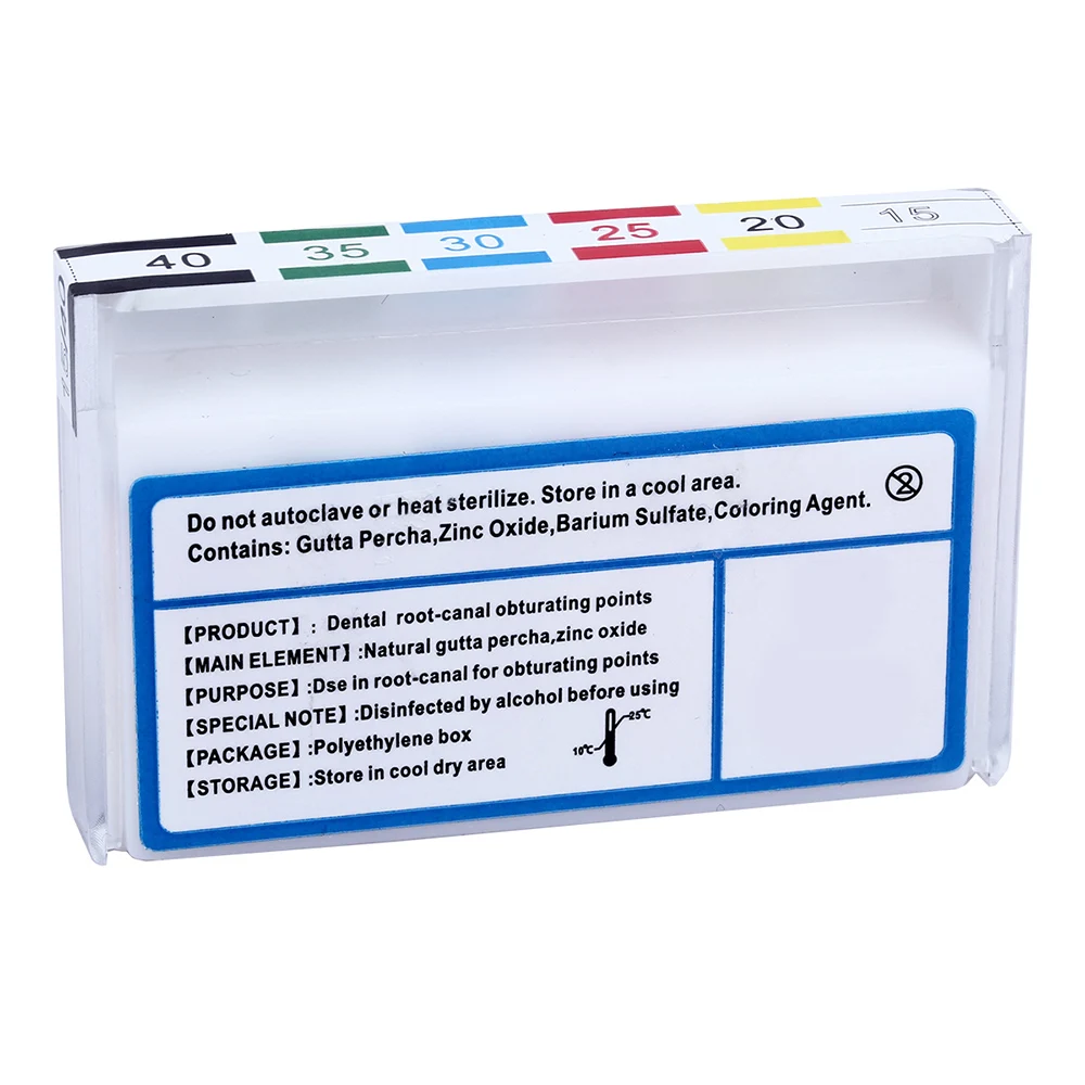 Contains: Guttta Percha,Zinc Oxide,Barium Sulfate,Coloring Agent.