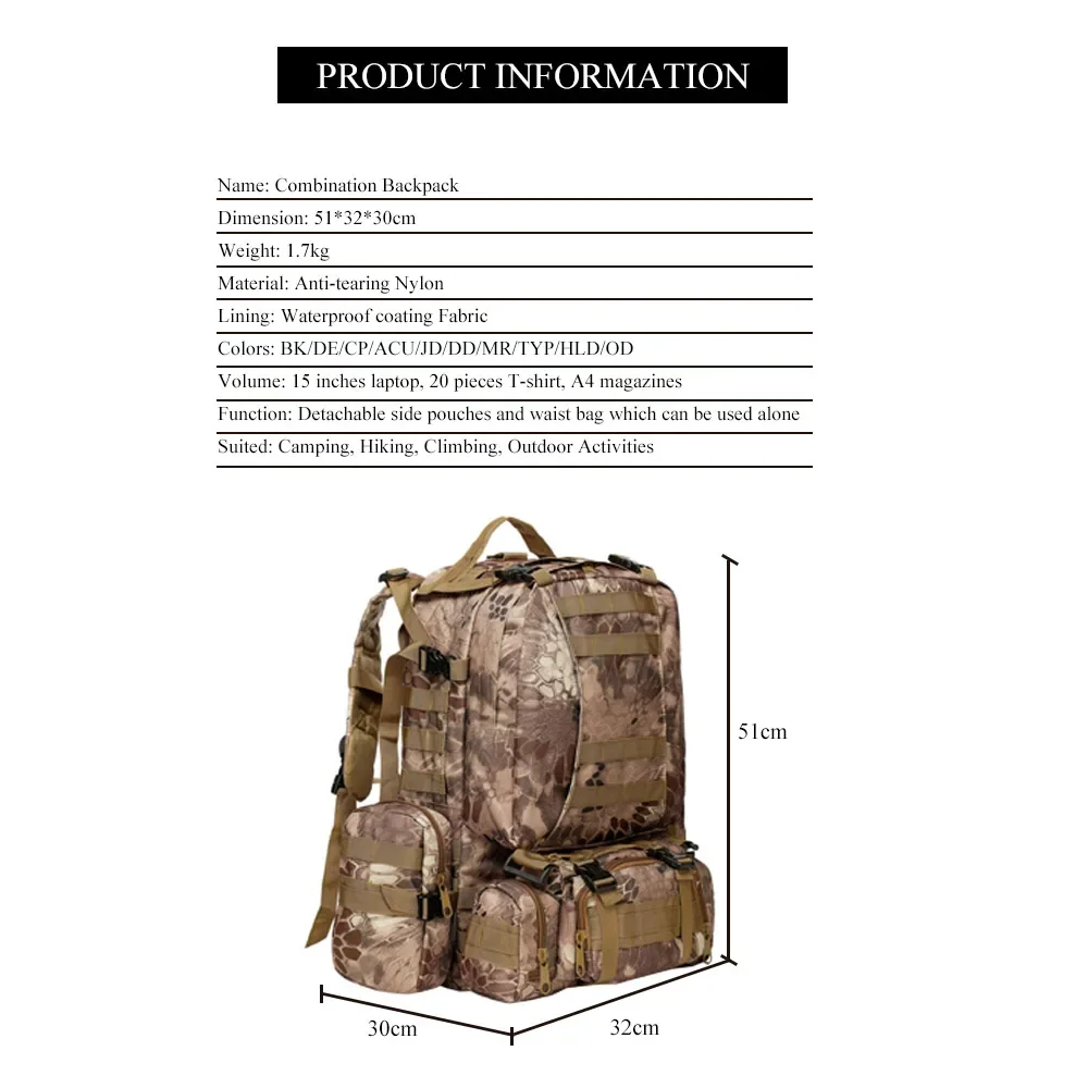 55L Molle High Capacity Nylon Tactical Backpack Assault Military Rucksacks Camping Hunting Sport Travel Hiking Army Outdoor Bag