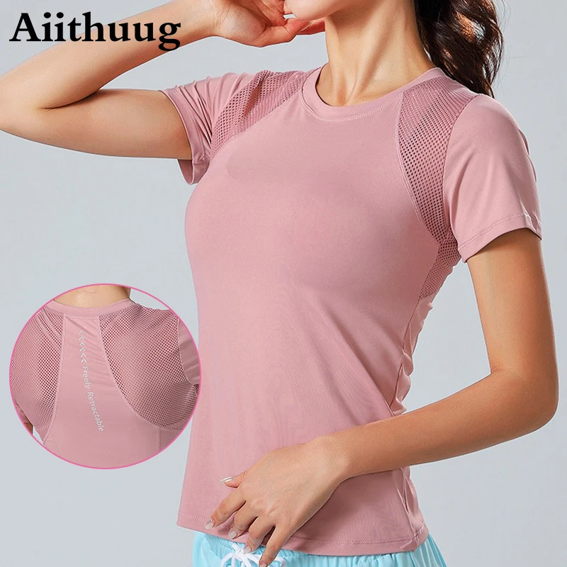 (Aiithuug Mesh Patchwork Round Neck Yoga Top With Reflective Stripes Women’s High Elasticity Breathable Workout Pilates Gym Shirt).