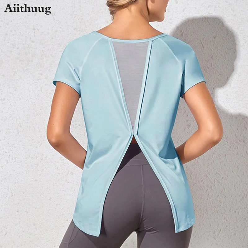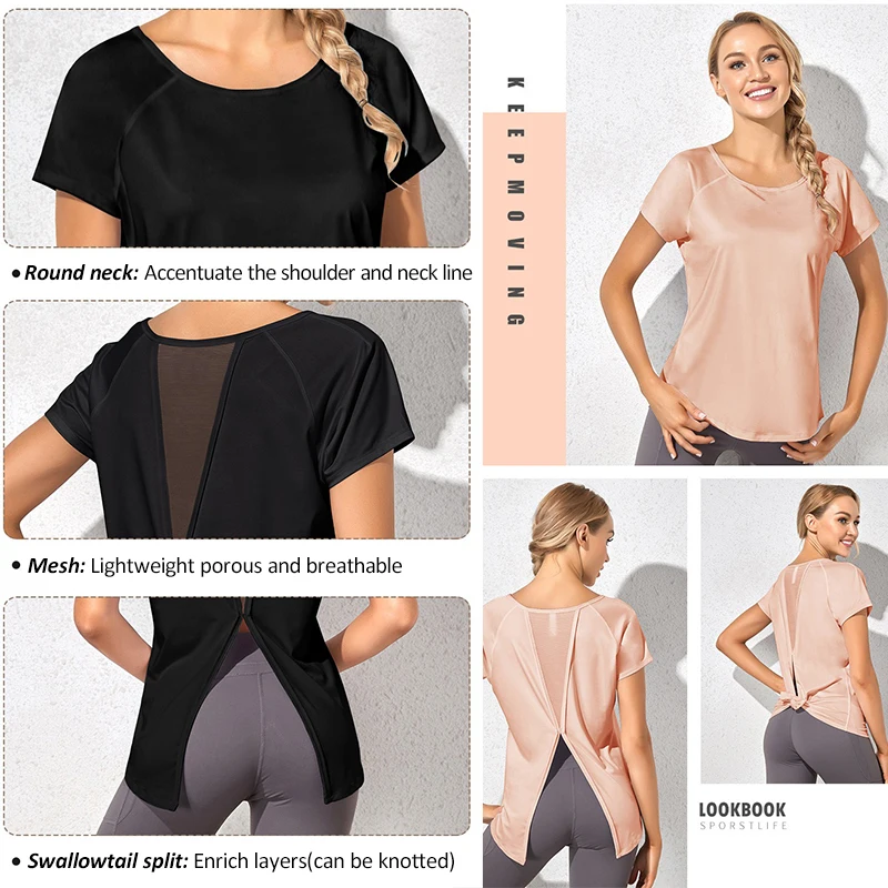 (Aiithuug Round Neck Mesh Back Dovetail Split Beauty Back Yoga Tops Quick Dry Breathable Shirts Athletic Running Gym Short Tops).