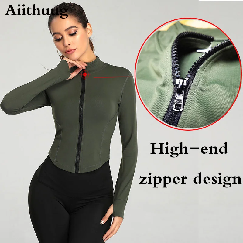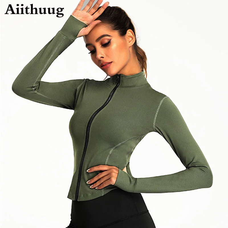 Aiithuug Women Stretchy Full Zip Workout Yoga Track Jacket Slim Running Sports Jackets with Thumb Hole Long Sleeve Running