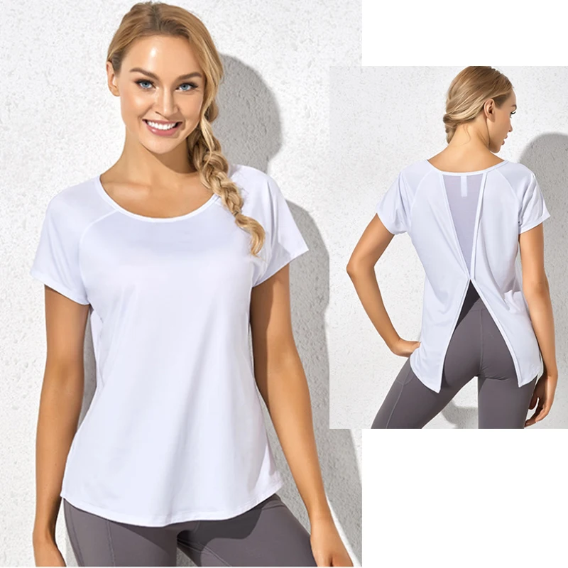 | Quick Dry Slit Back Slash Workout Shirt | Yoga Short Sleeve Blouse Mesh Breathable Back Sexy Back Cool Feeling |