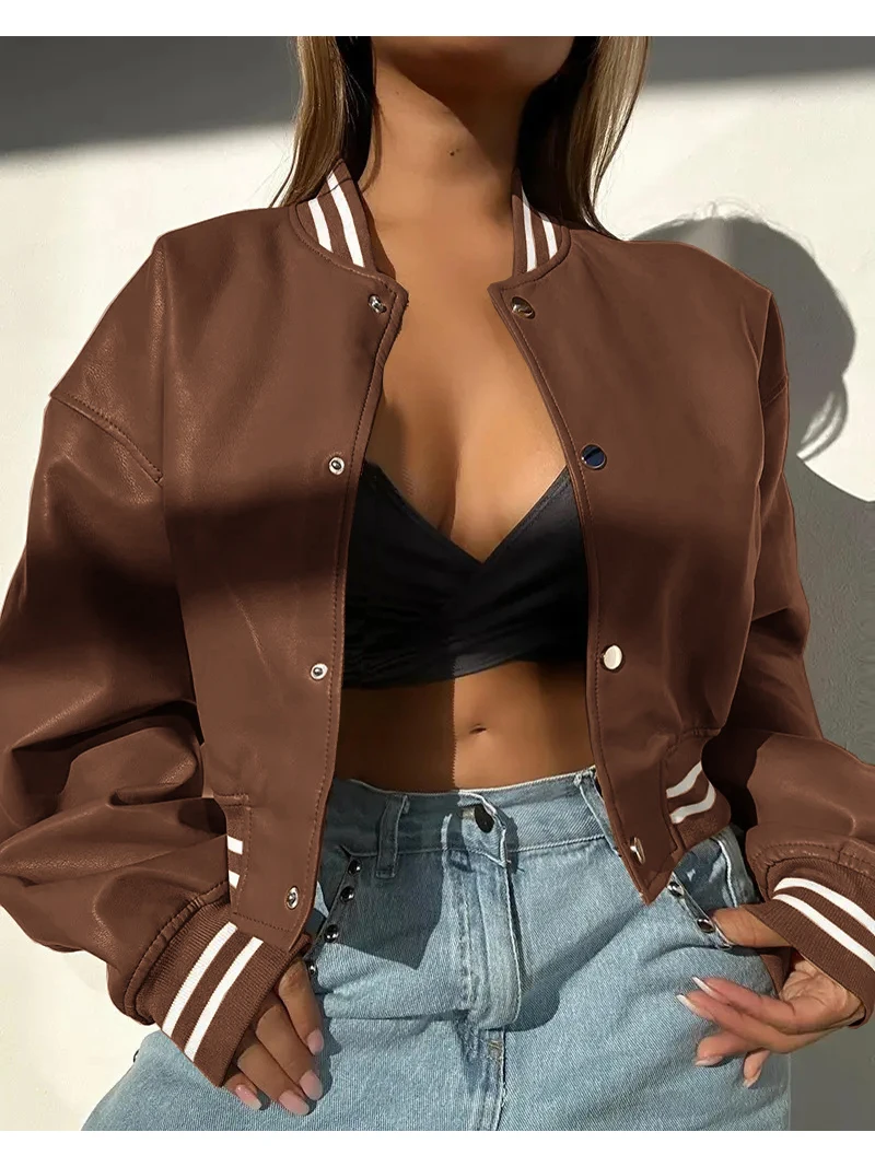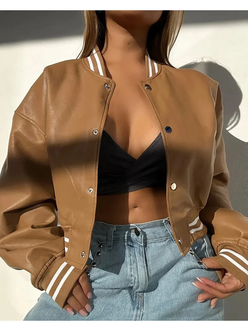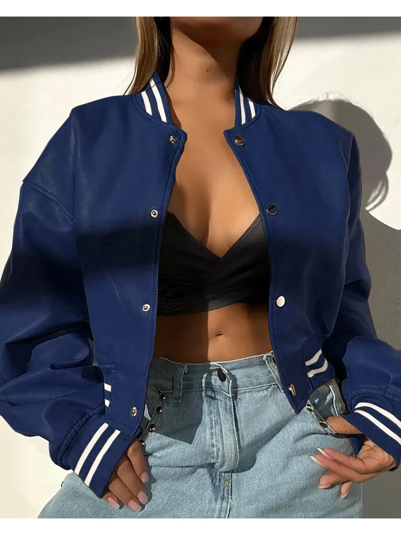 Autumn Women Striped Baseball Single Breasted Jackets Fall Winter Long Sleeve Coats 2YK Motorcycle Girls PU Leather Outerwear