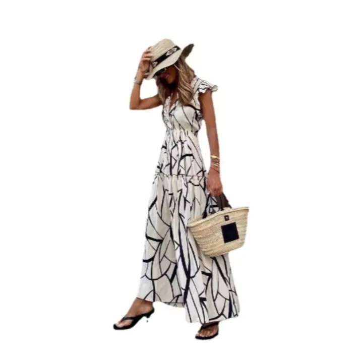 Bohemian V-neck Women's Flying Sleeve Dress Cool And Loose Sleeveless Beach Dress Summer New Geometric Print Party Women's Dress