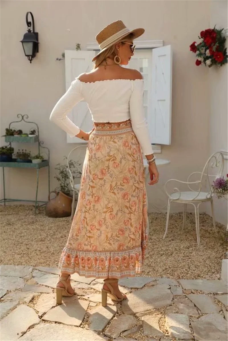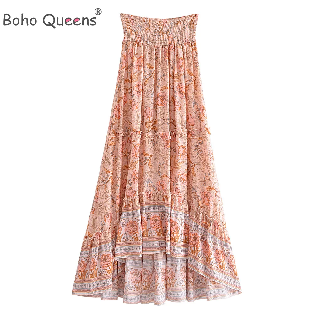 Boho Queens Fashion Vintage Women Beach Bohemian Floral Peacock Print Skirt High Elastic Waist Maxi A-Line Skirts Femme
