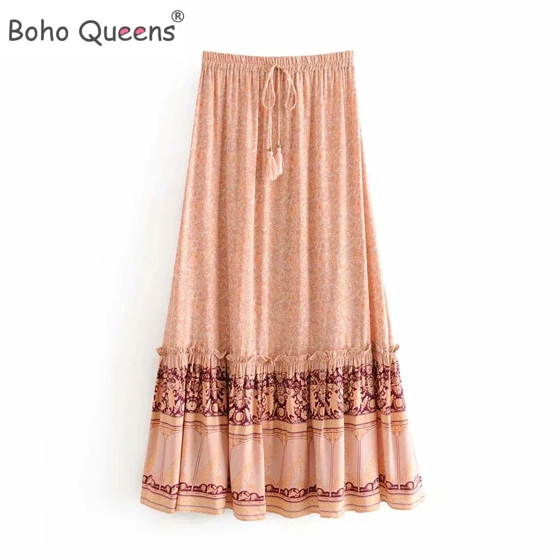 Boho Queens Fashion Women Floral Peacock Print Beach Bohemian Maxi Skirt High Elastic Waist Rayon A-Line Skirt Femme