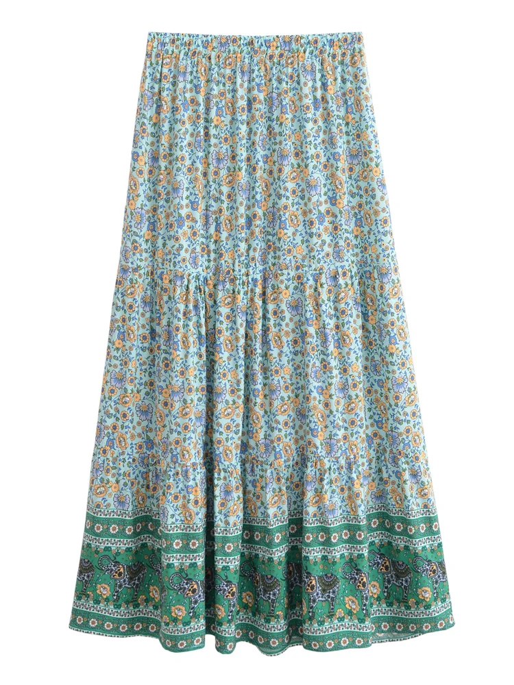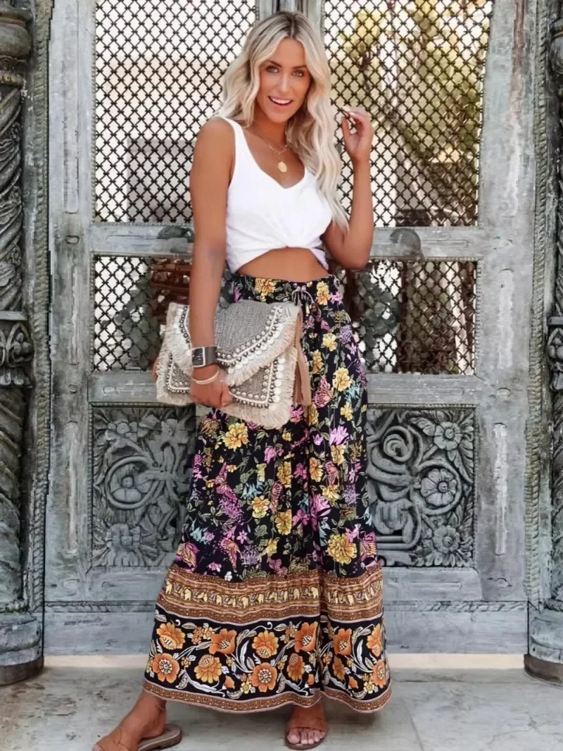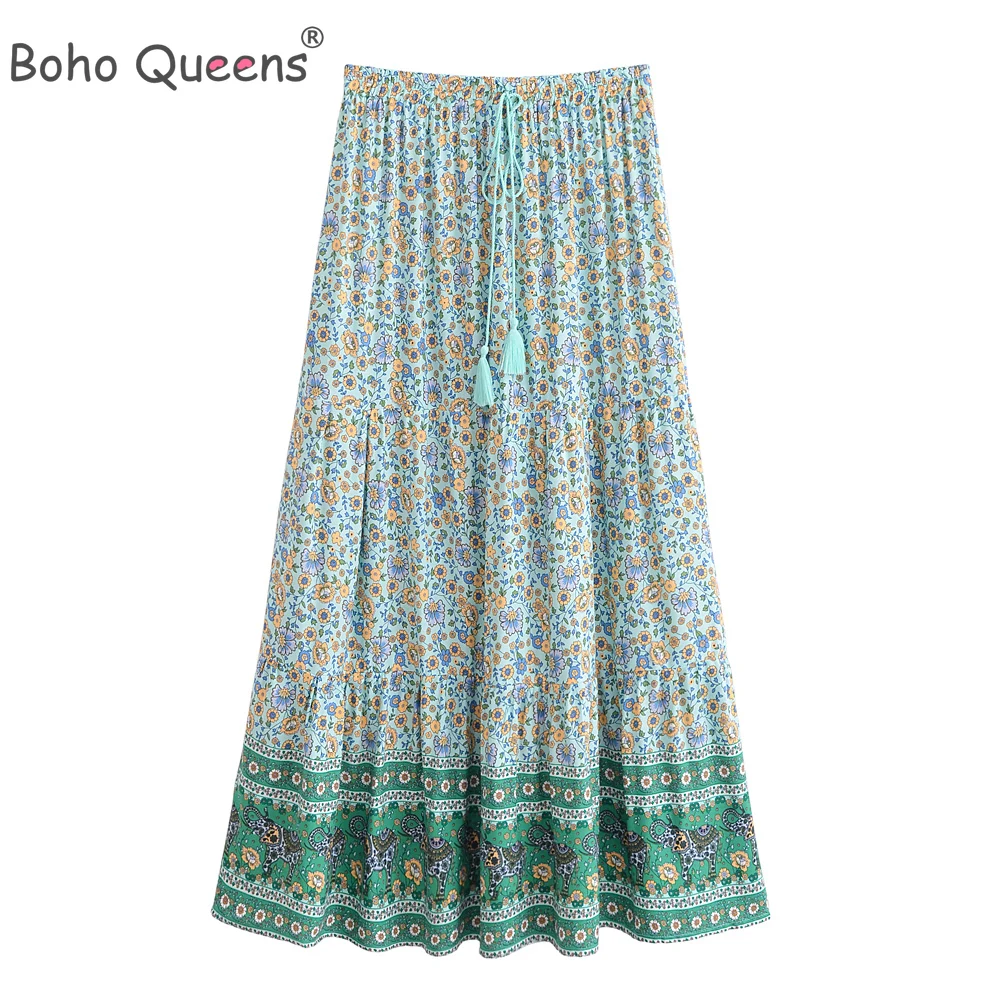 Boho Queens Hippie Women Bohemian Animal Floral Print Beach Skirt High Elastic Waist Maxi A-Line Holiday Boho Skirt Femme