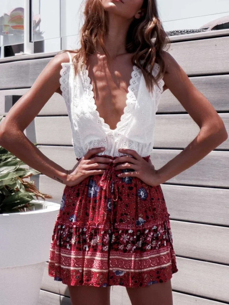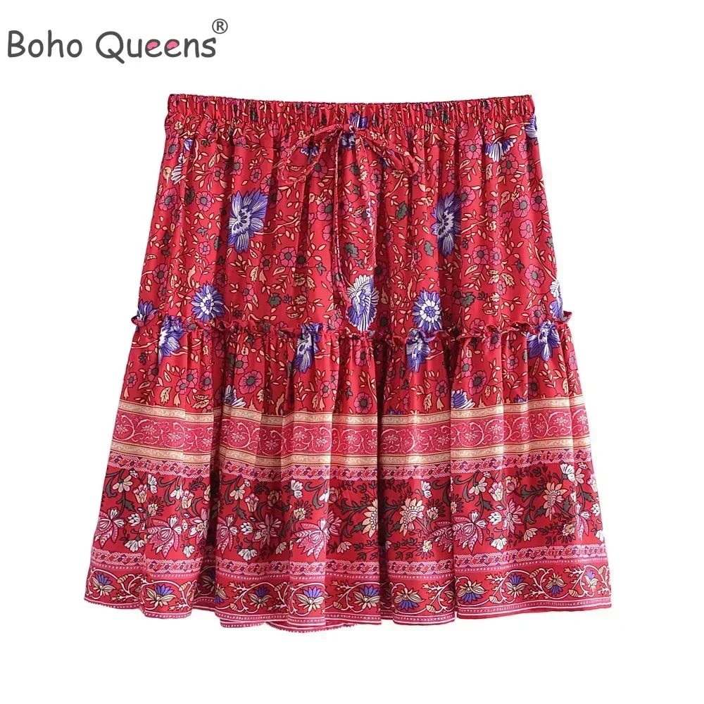 Boho Queens Summer Women Ruffles Wild Floral Printed Beach Skirt Bohemian Lady Rayon Vacation Boho Mini Skirts