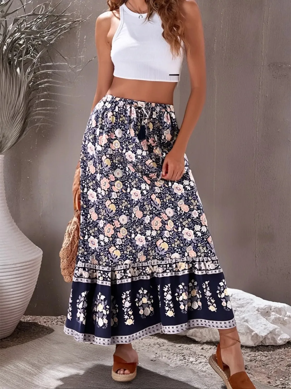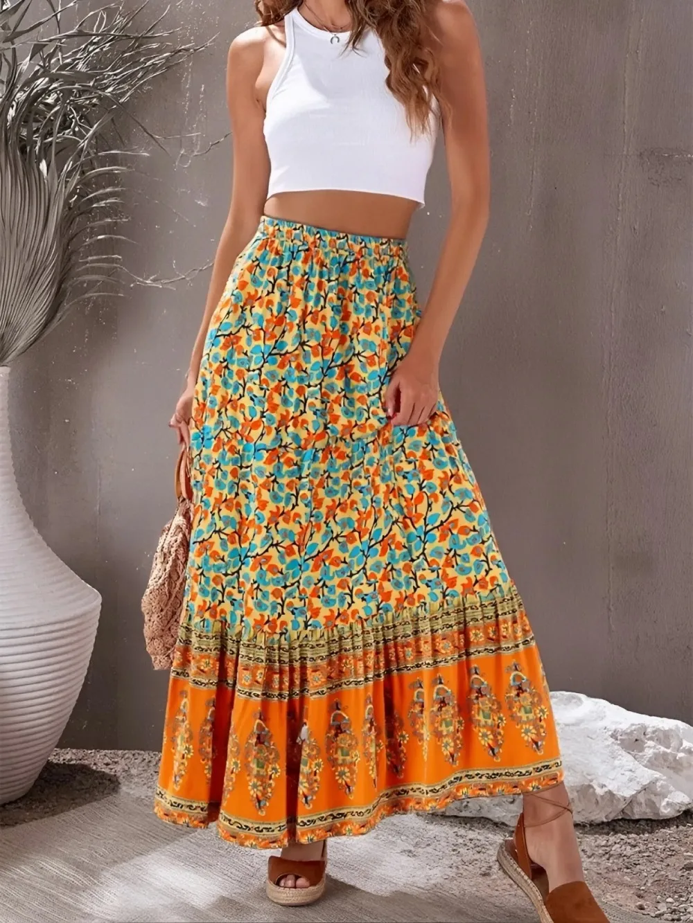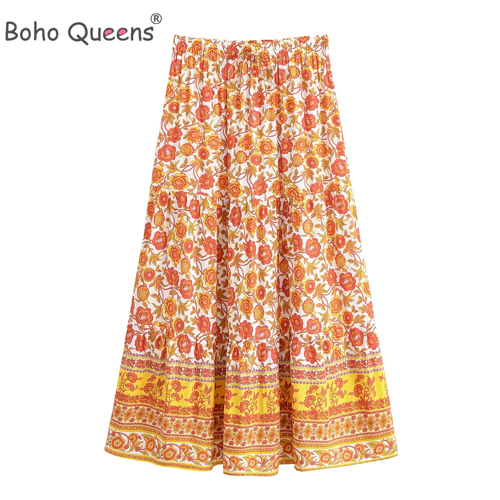 Boho Queens Vintage Women Fashion Summer Maxi Skirt Rayon Elastic Yellow Floral Printed Beach Bohemian Pleated Skirts