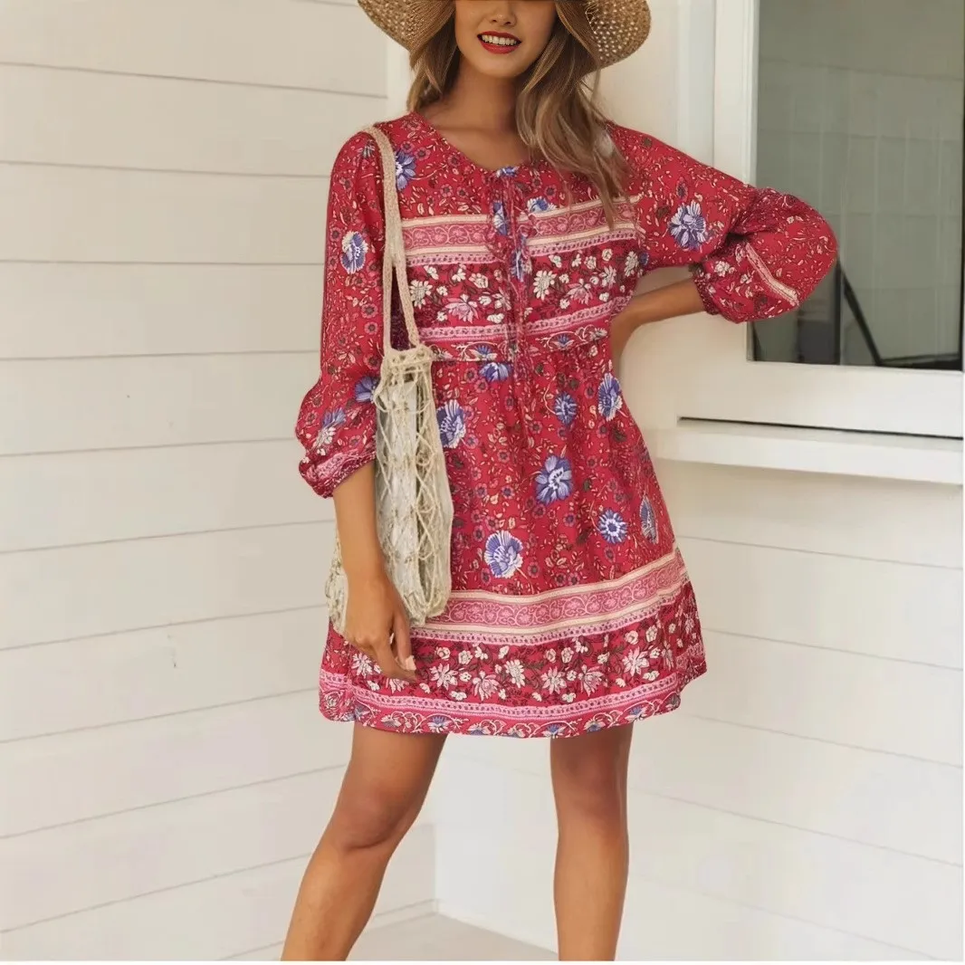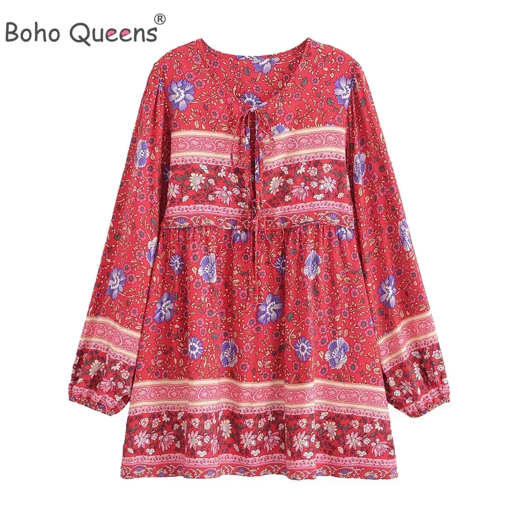 Boho Queens Women Ethnic Floral Print Long Sleeve Beach Bohemian Mini Dresses Ladies Tie Neck Rayon Holiday Dress Vestidos