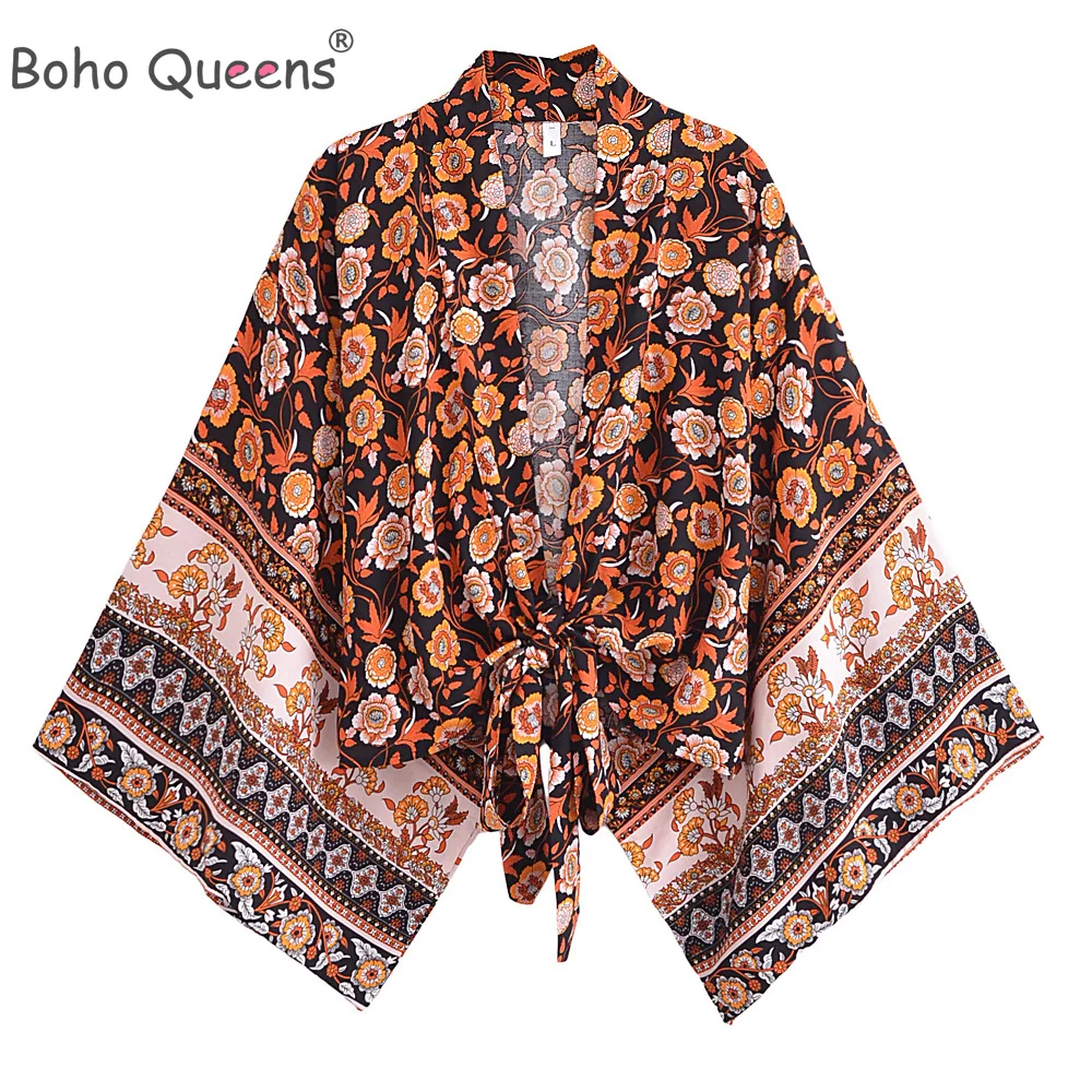 Boho Queens Women Fashion Beach Kimono Short Robe Swimsuits Floral Batwing Sleeves Rayon Bohemian Bikini Cover Ups Beachwear