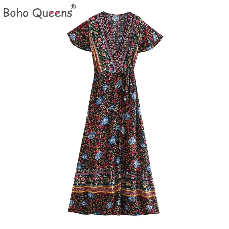Boho Queens Women Floral Print Bat Sleeve Beach Robe Bohemian Maxi Dresses Ladies Sexy V Neck Summer Happie Dress Vestidos