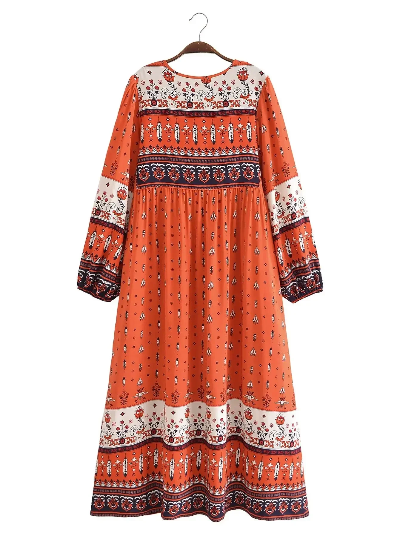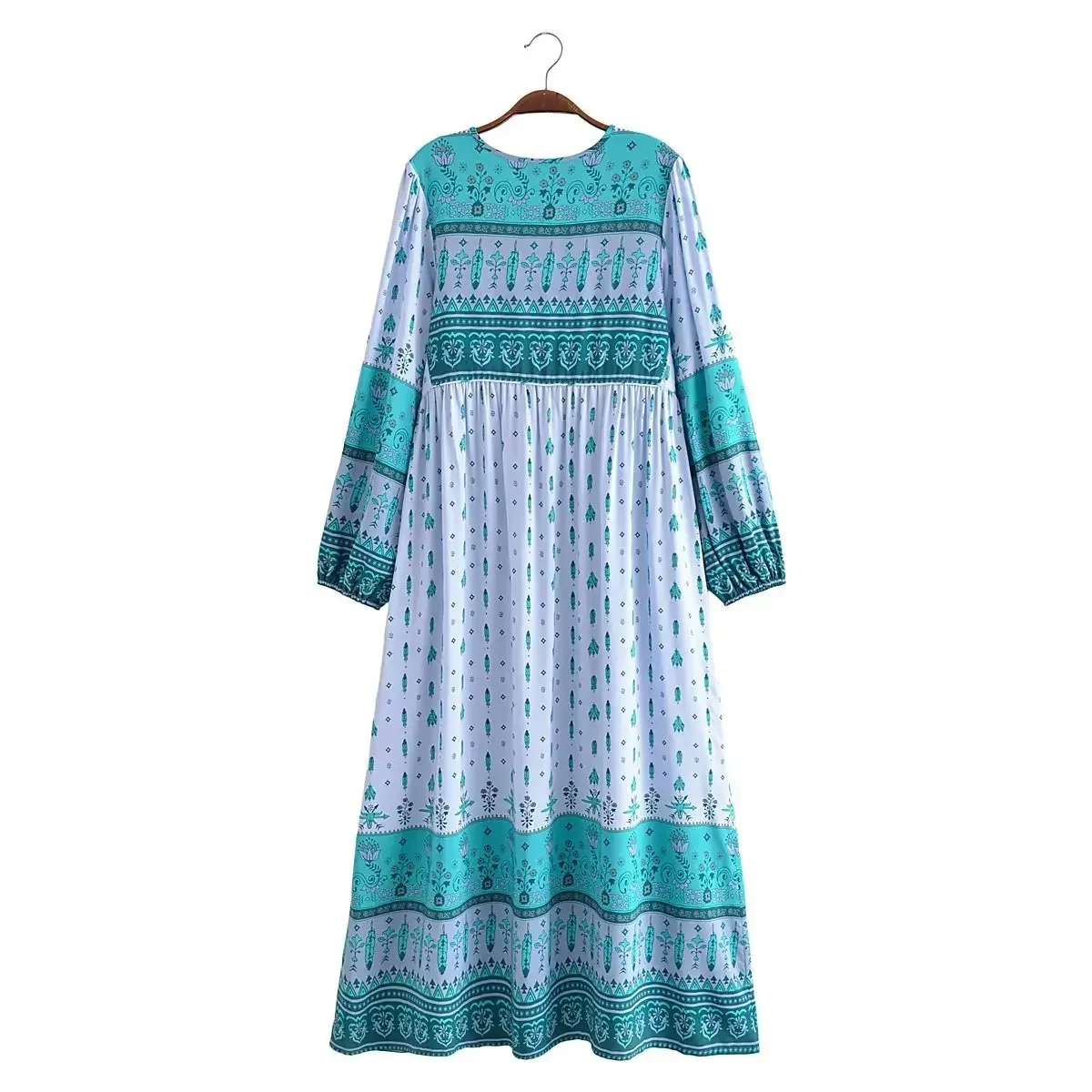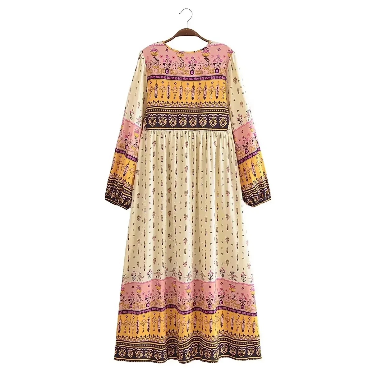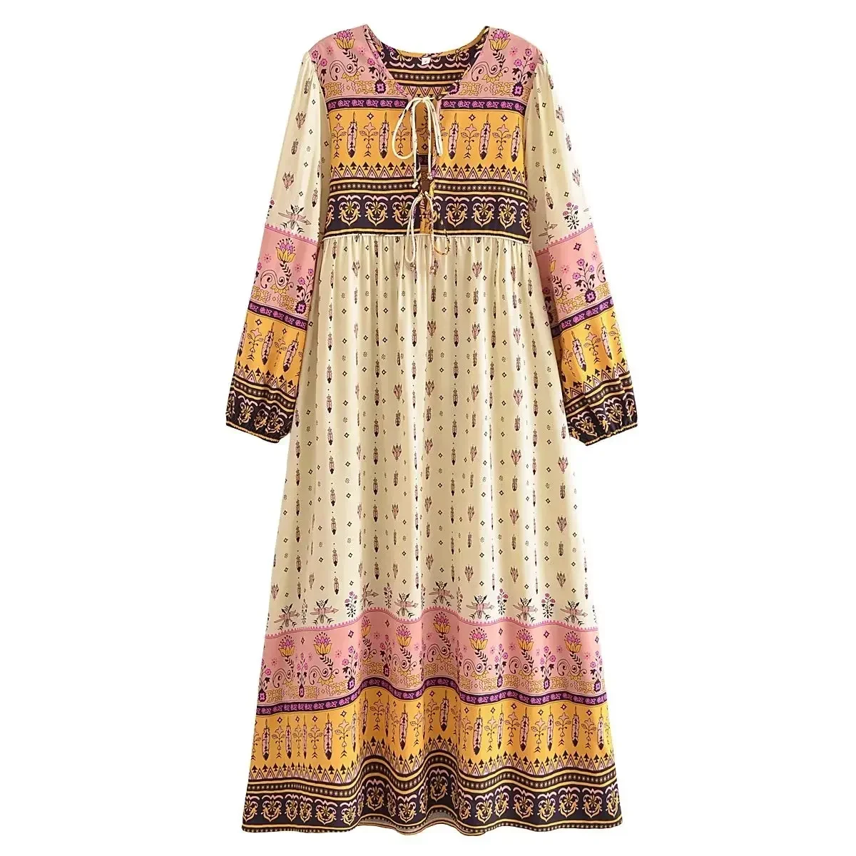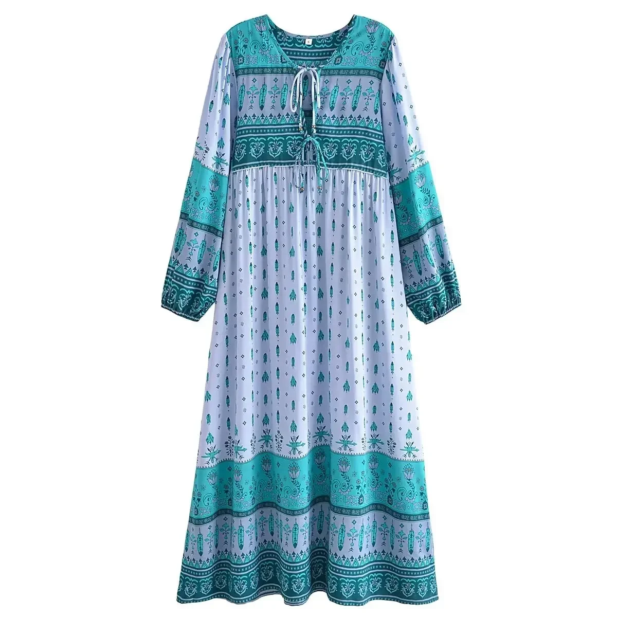 Boho Queens Women Floral Print Belt Tassel Beach Bohemian Maxi Dress Ladies Long Sleeve V-neck Cotton Pleated Sundress Vestidos
