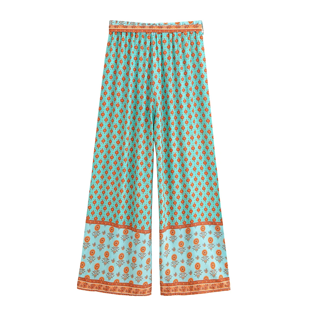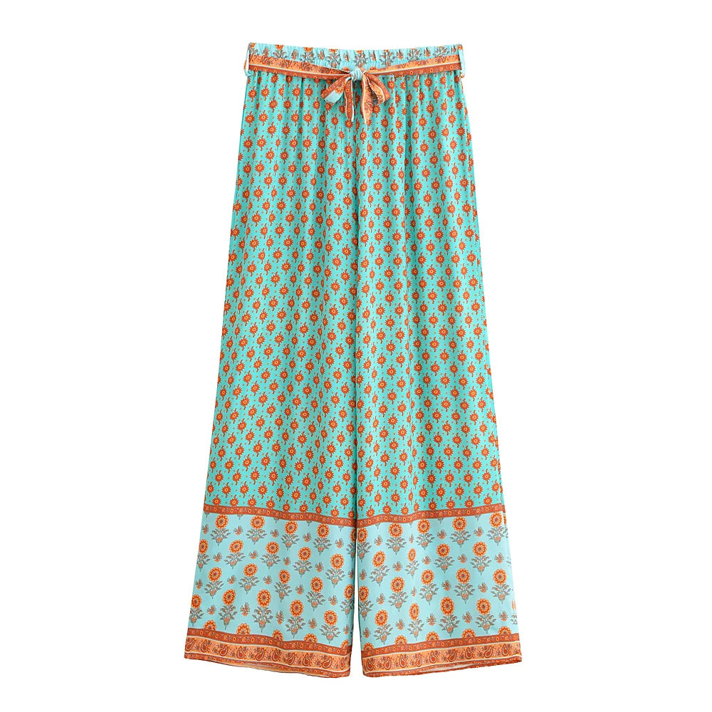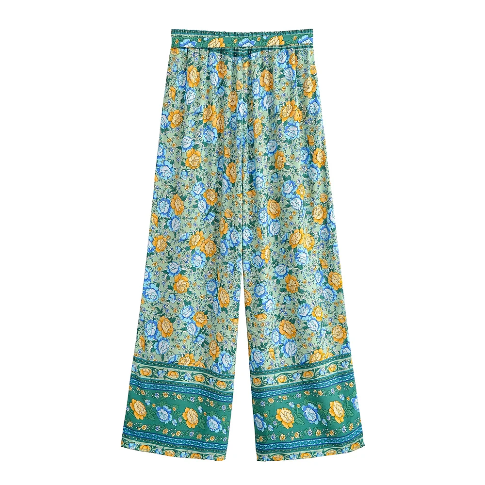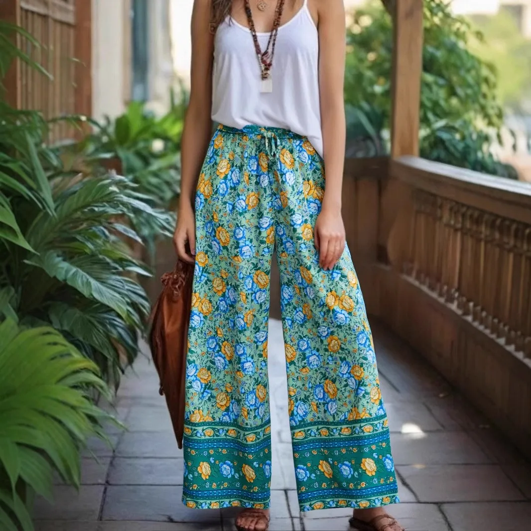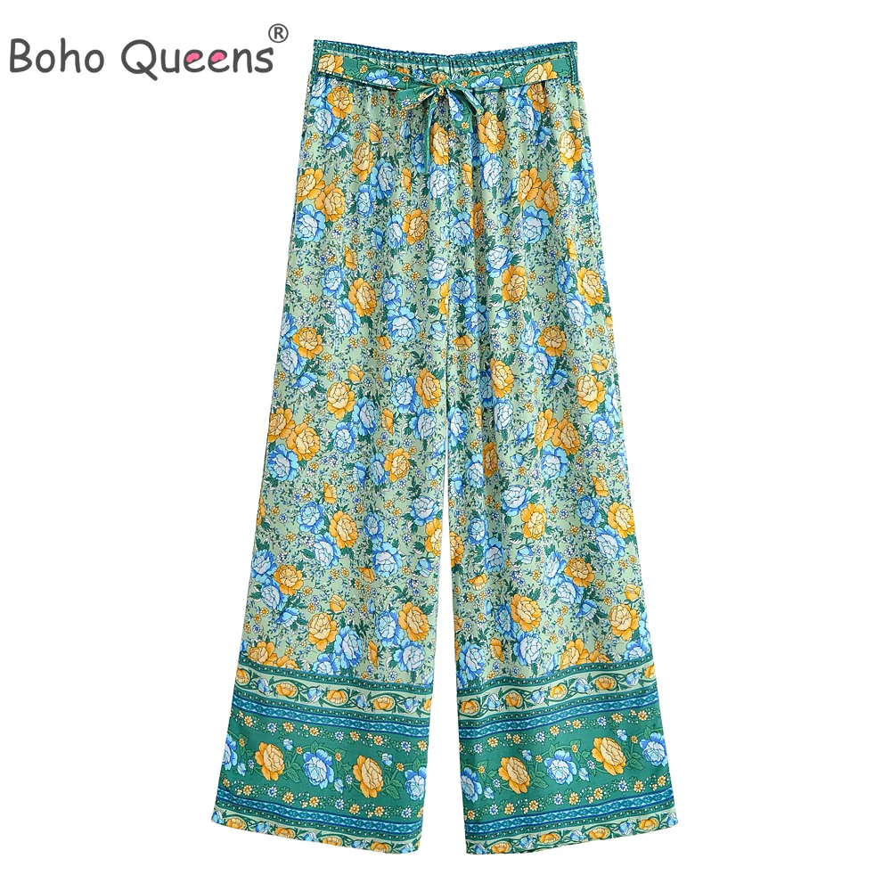 Boho Queens Women Floral Print Bohemian Wide Leg Pant Lady Elastic Waist Loose Rayon Vacation Boho Pants Oversize Trousers