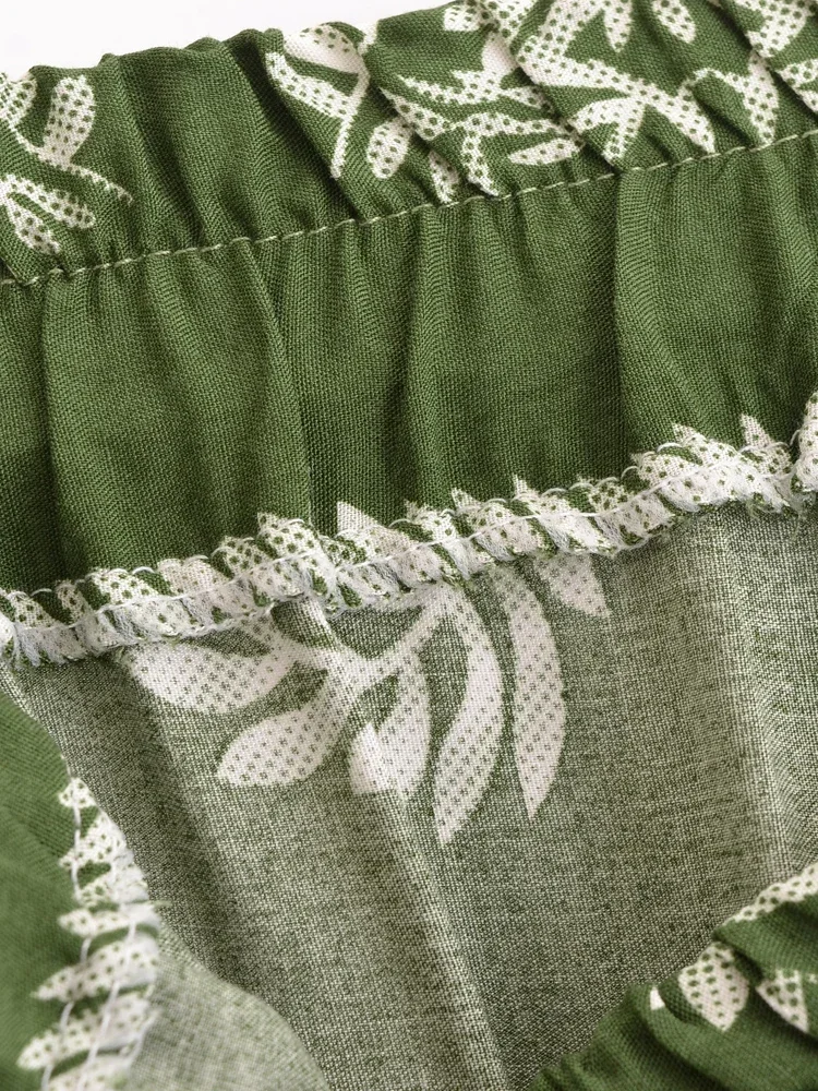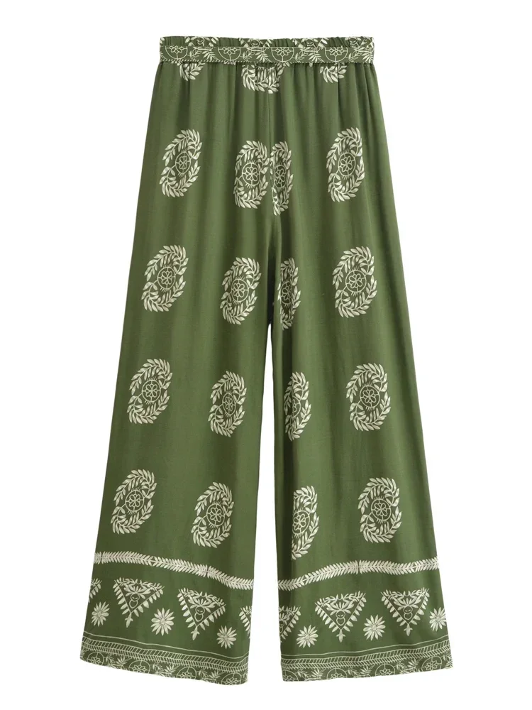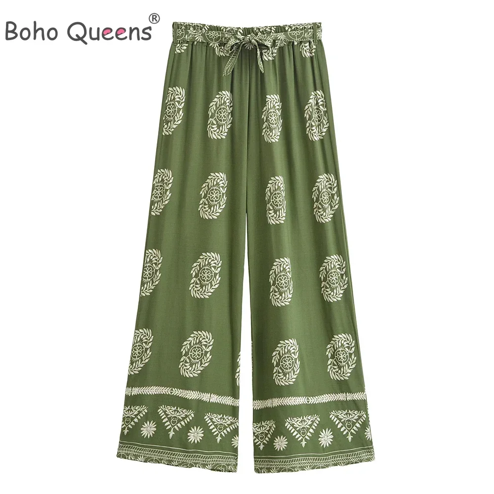 Boho Queens Women Green Floral Bohemian Wide Leg Pants Lady Elastic Waist Loose Vacation Boho Pants Oversize Trousers