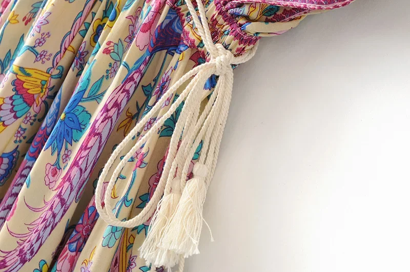 Boho Queens Women Peacock Floral Print Bat Sleeve Beach Bohemian Maxi Dresses Ladies V Neck Tassel Summer Dress Vestidos