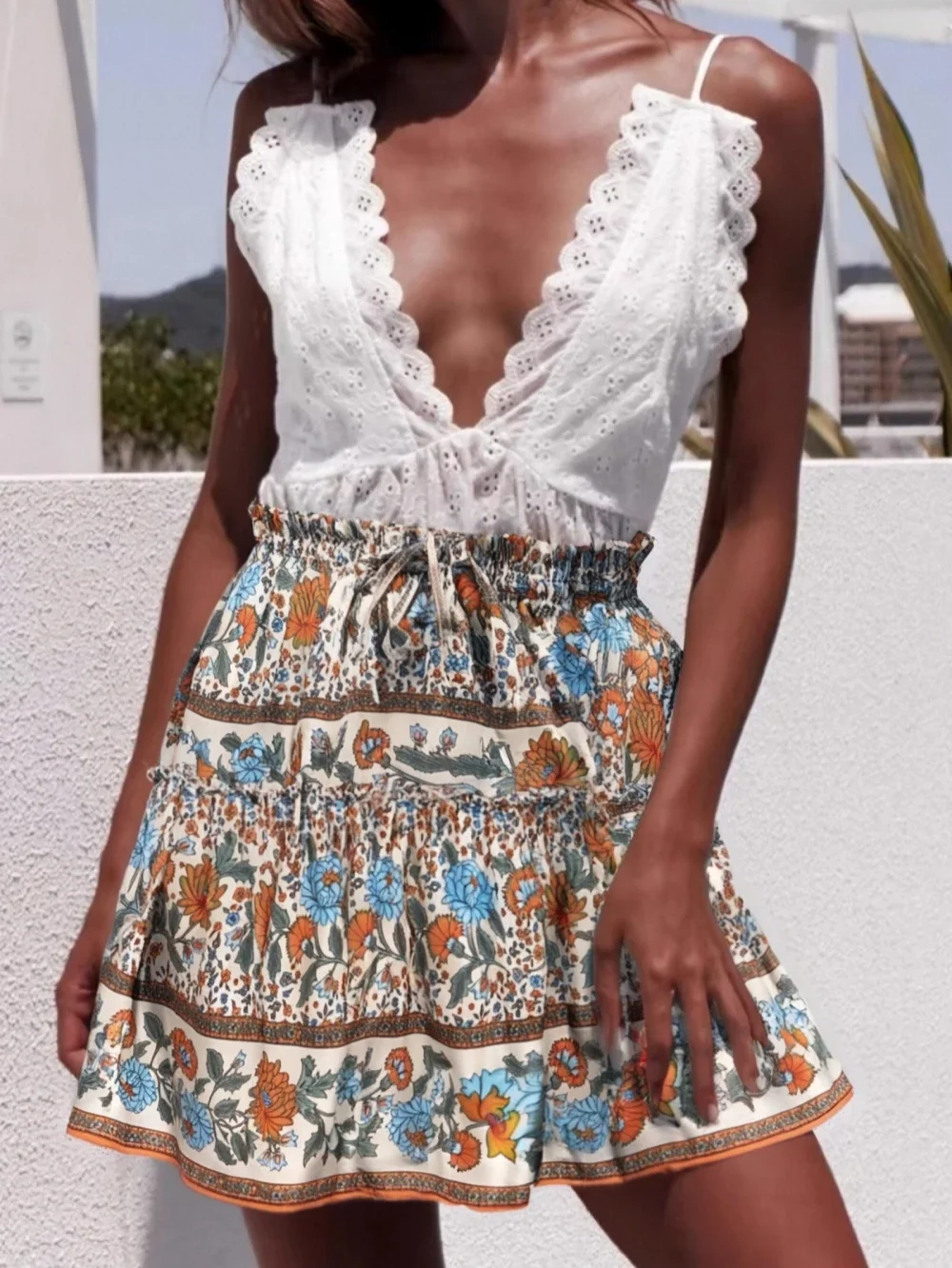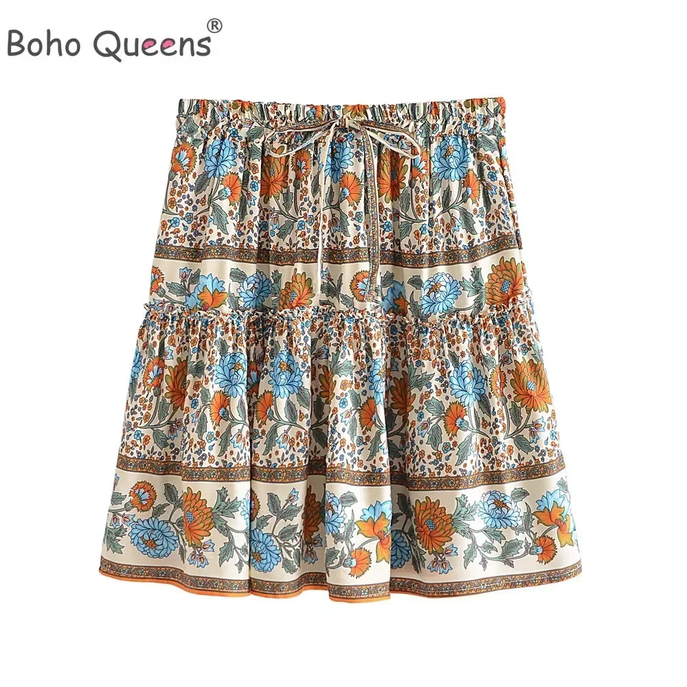 Boho Queens Women Vintage Summer Ruffles Tassel Short Skirt Bohemian Elegant Floral Printed Rayon Cotton Mini Skirts