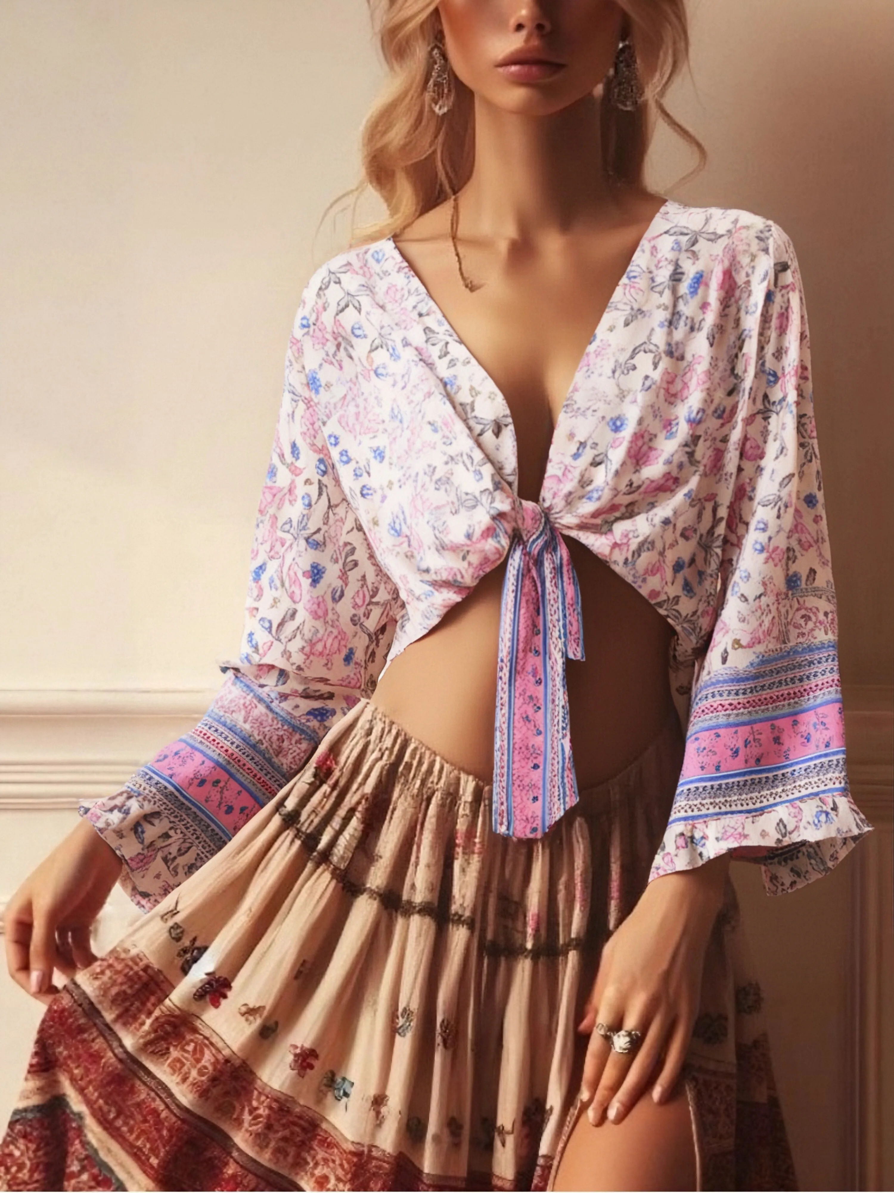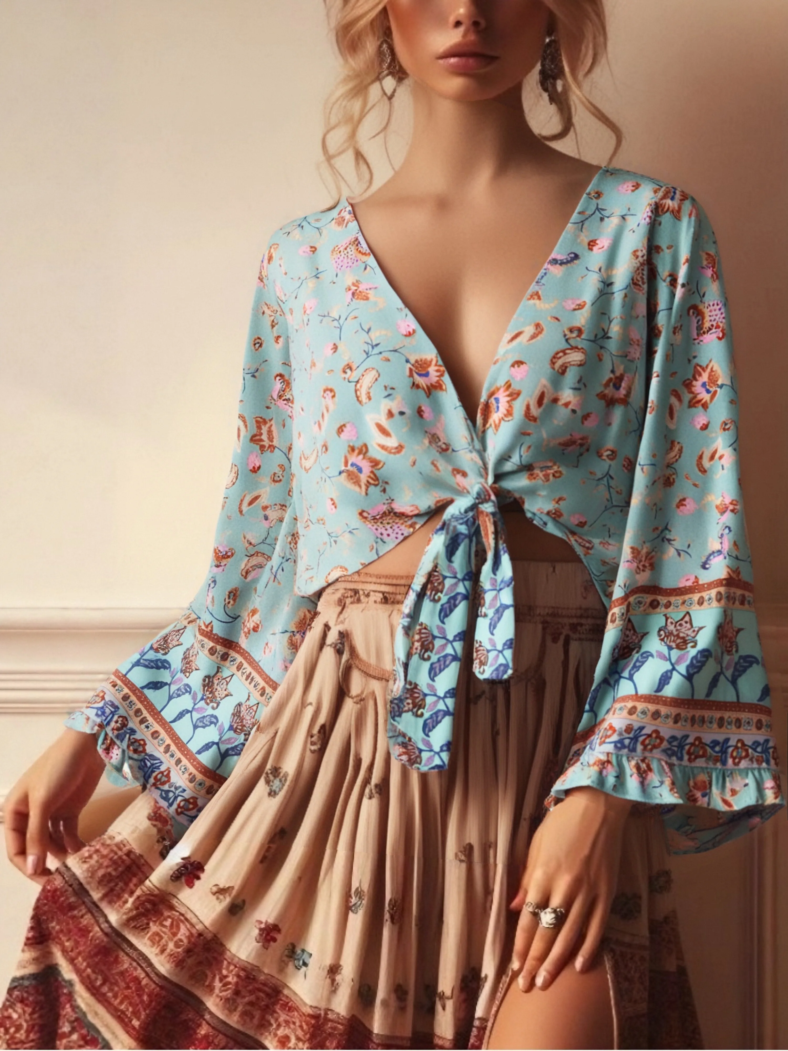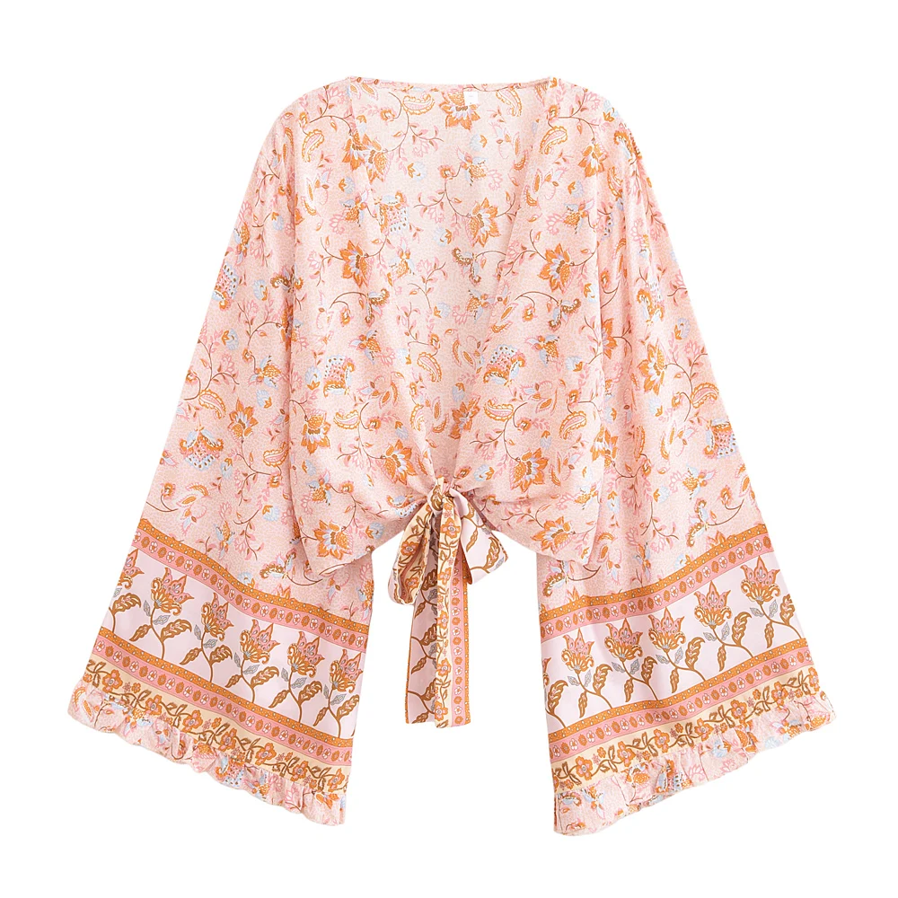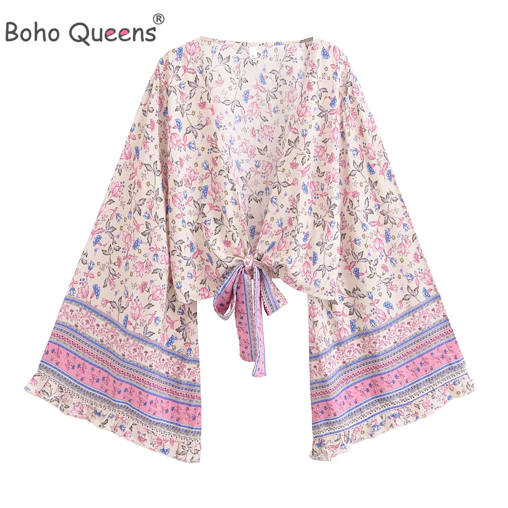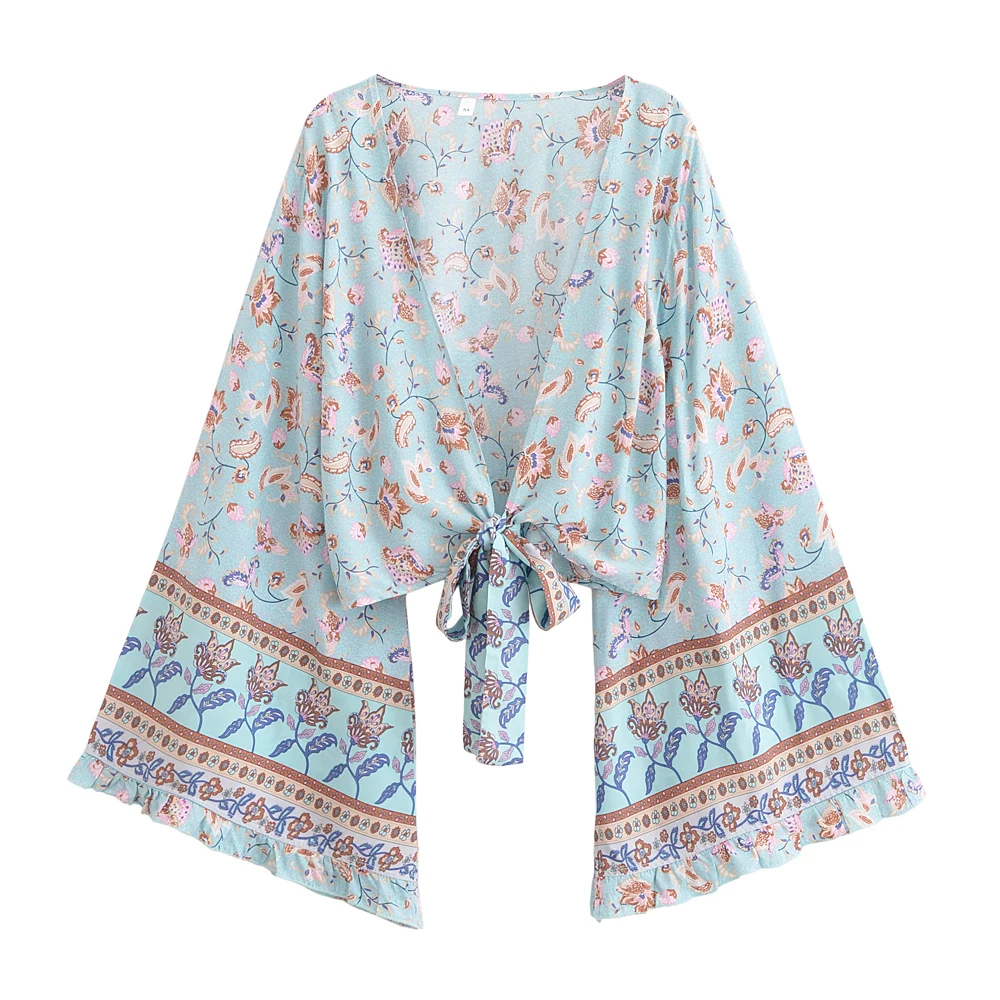 Boho Queens Women Wild Floral 2025 Beach Summer Short Kimono Ruffles Flare Sleeves Vacation Bohemian Bikini Boho Cover-ups
