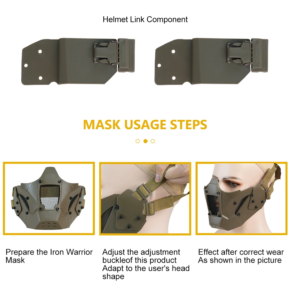 Compatible with most eye protection goggles. The packaging includes side clips for mounting various quick helmets. Simply uninstall the belt and install the side clips and place the mask on the helmet rail.