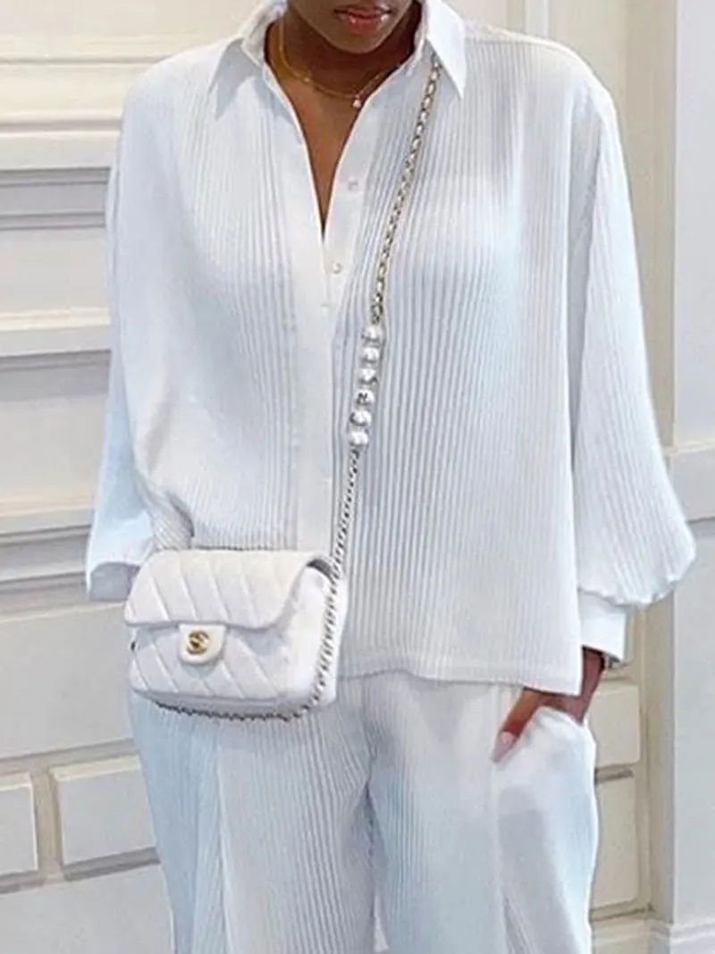 Classic Solid Shirt Pants Set Women Casual Loose Long Sleeved Lapel Elastic Waist Two Piece Suit 2025 New Summer Street Outfit