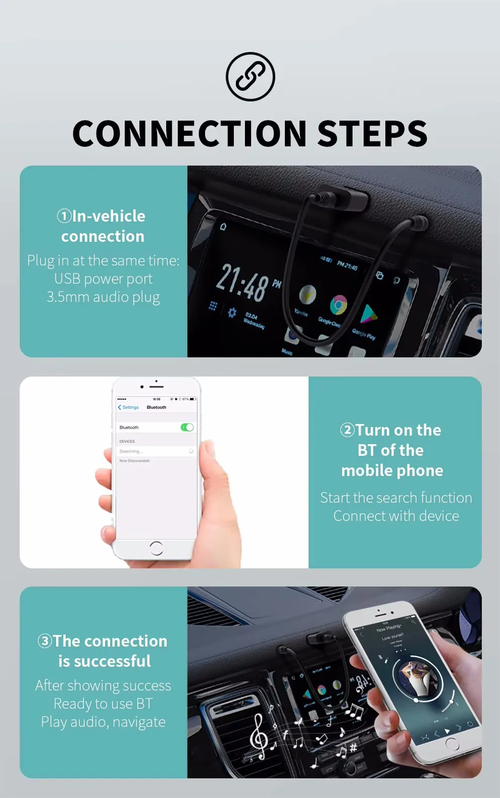 Note: Please ensure your car with 3.5mm AUX hole, the device should connect to car AUX hole and then work.