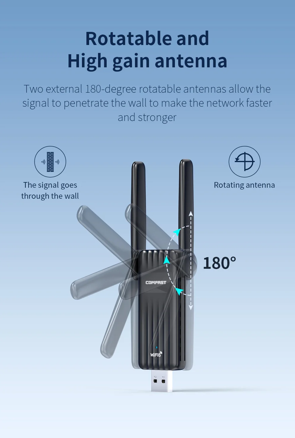 Two external 180-degree rotatable antennas allow thesignal to penetrate the wall to make the network fasterand stronger
