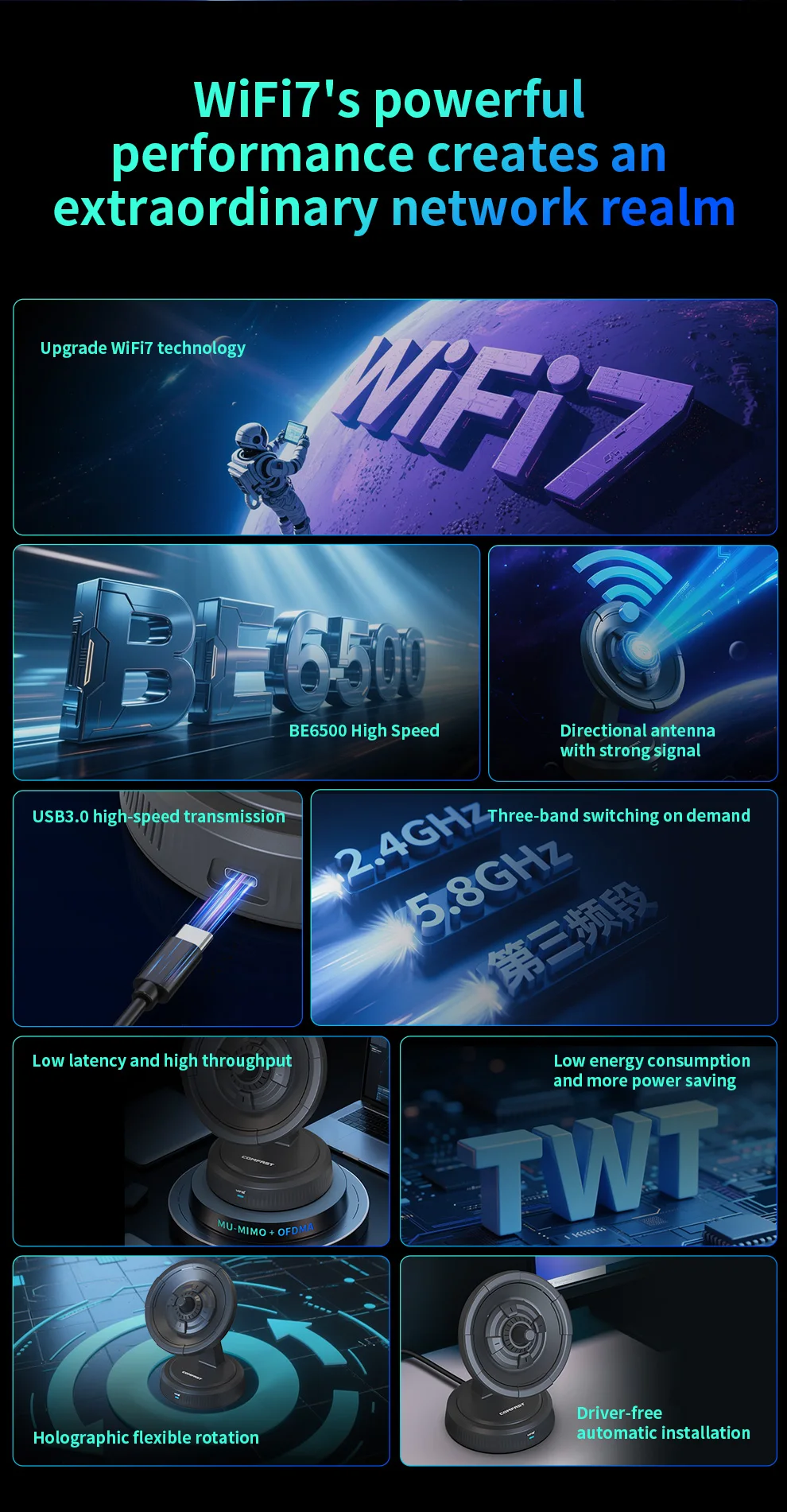 COMFAST BE6500 WiFi 7 USB Adapter 2.4G/5.8G/6G USB 3.0 Directive Antenna 6dBi Network Card Driver-Free For PC/Laptop Win10/11