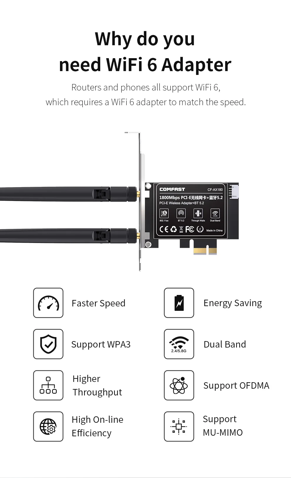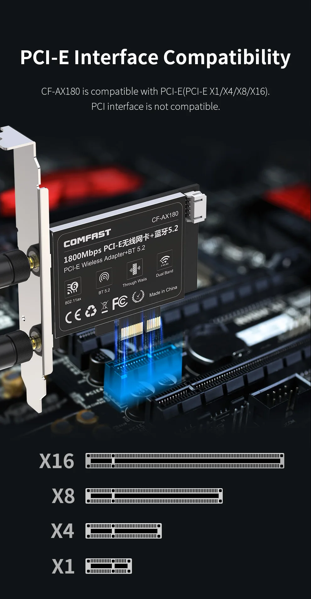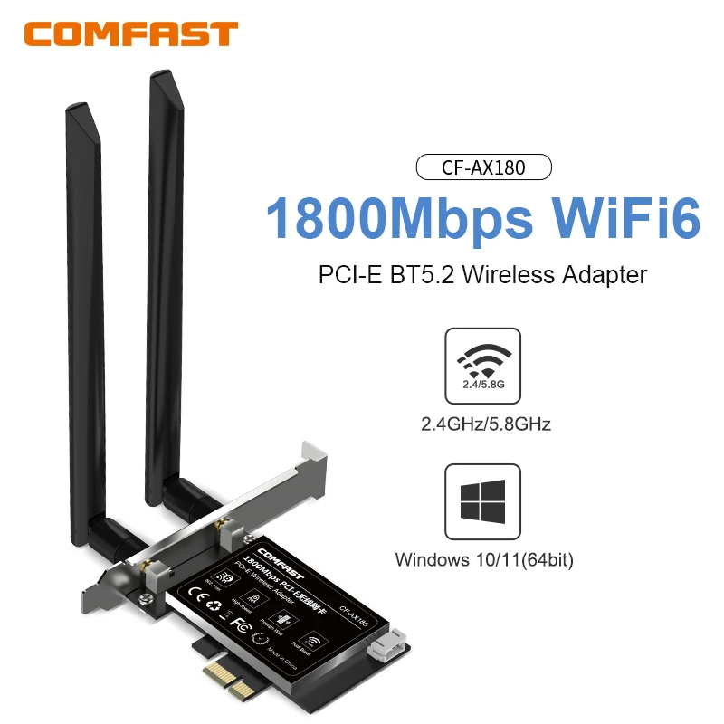 comfast High Speed 1800Mbps WiFi6 PCI-E BT5.2 Wireless Adapter USB 2.0 dual-band 2.4GHZ/5.8GGHZ For windows 10/11 Network Card
