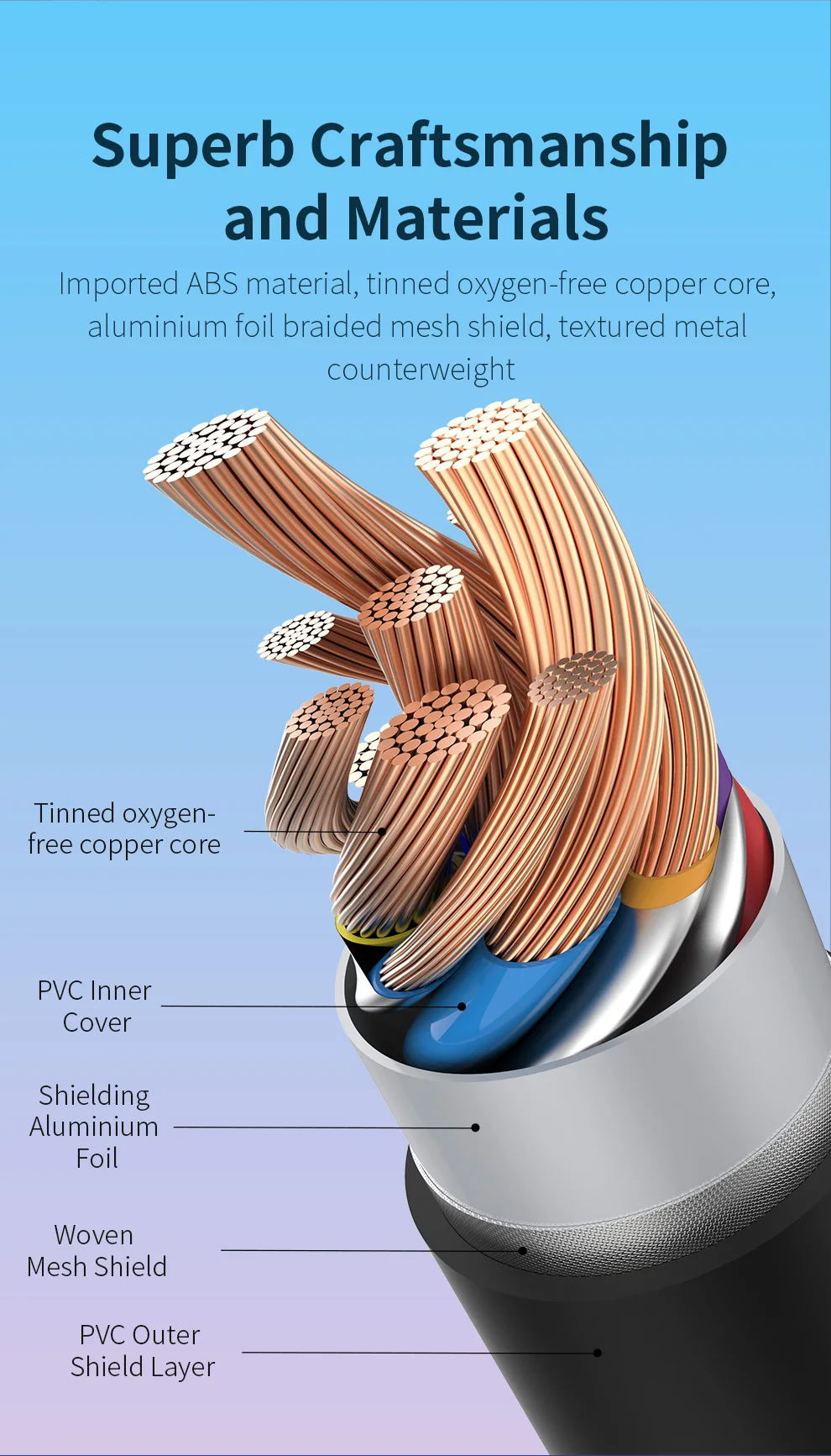 Imported ABS material , tinned oxygen-free copper core,aluminium foil braided mesh shield , textured metal counterweight
