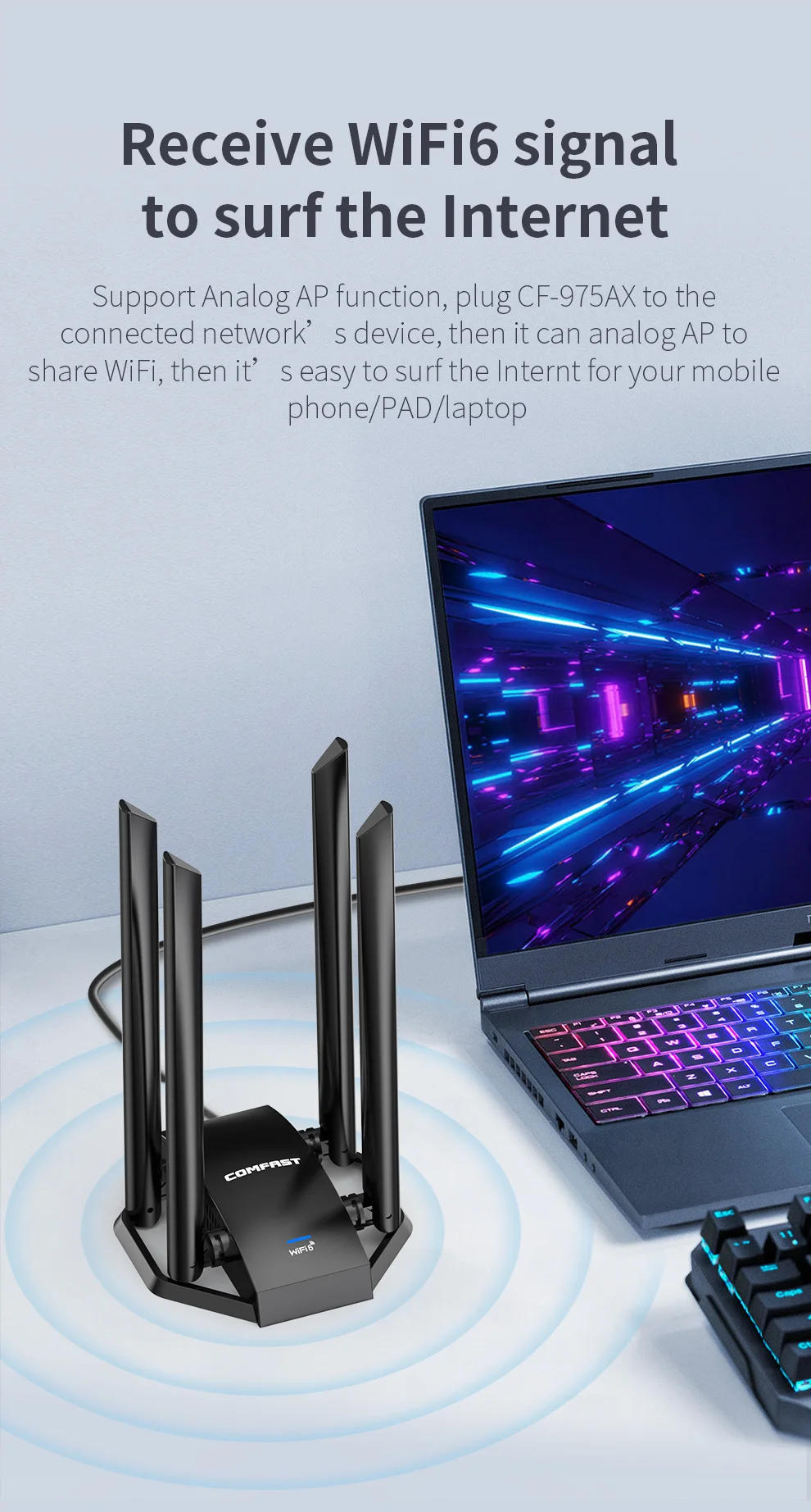USB Wifi Adapter AX5400 WiFi6 Wireless Network Card 2.4G&5G&6G 4 Antennas Free Driver Wi Fi Dongle WPA3 Win10 11 CF-975AX