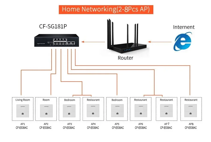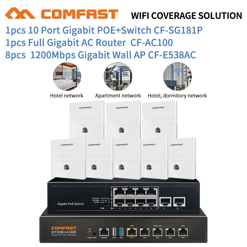 comfast Wi fi Kit 8pc 1200Mbps Access Point Wall AP+ 1p Load Balance Gigabit Controller Mult-Wan Router +1pc 10 Poe Swich