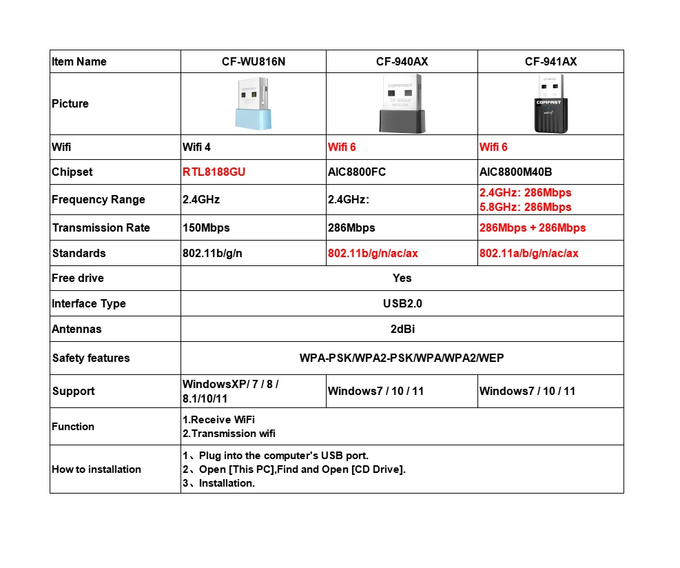 Mini Comfast Wifi 6 USB Adapter 2.4Ghz Wi Fi 4 Adaptador Driver Free Placa De Rede 150M 300M 600M Wireless Network Dongle for PC