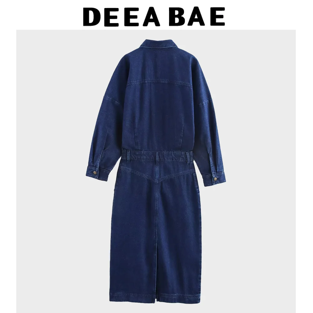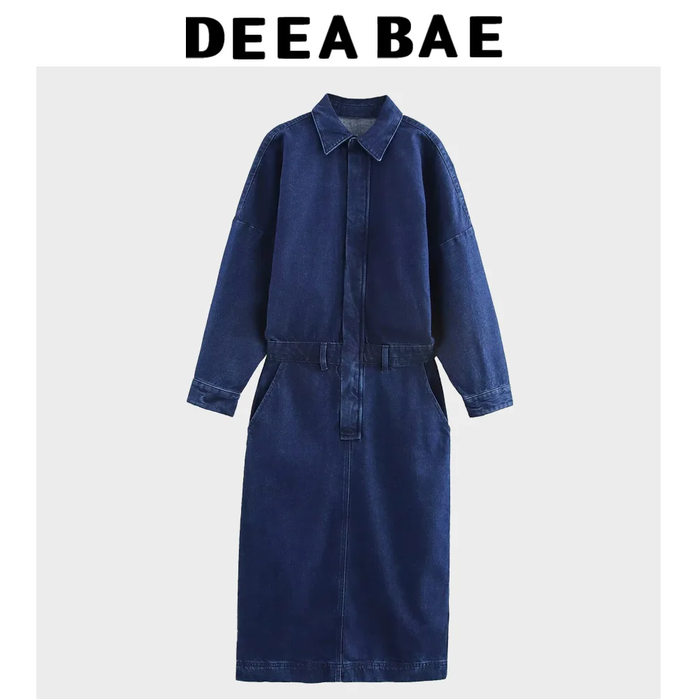 DEEABAE 2025 Spring New Product Women's Clothing Style Casual Loose Cowboy Long Sleeve Collar Midi Dress
