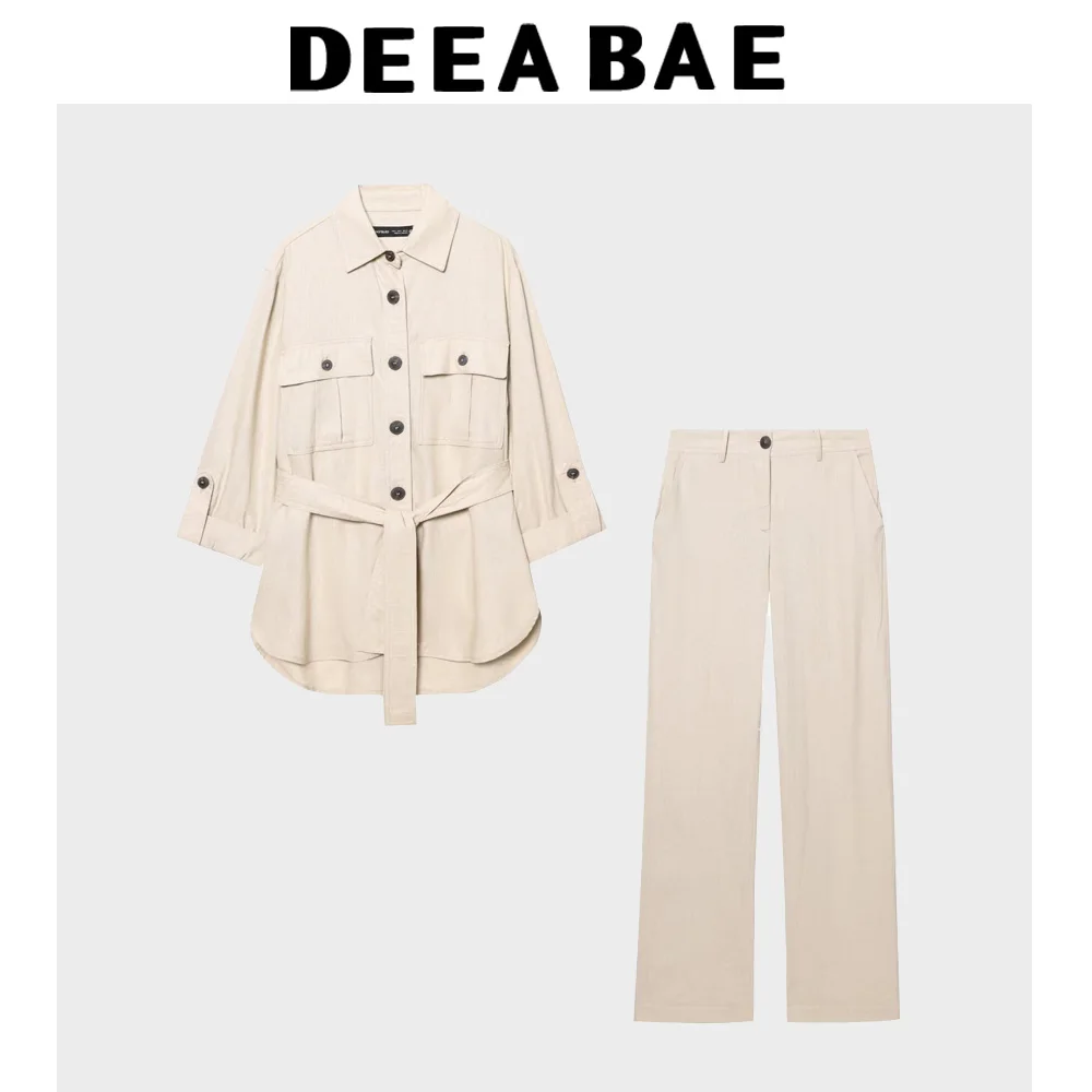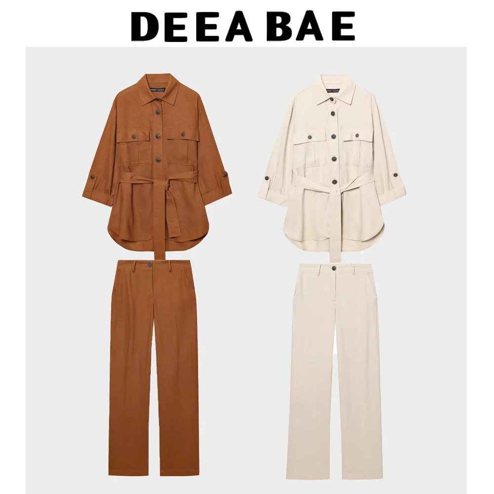 DEEABAE 2025 Spring New Product Women's Linen Blended Loose Long Sleeve Collar Shirt Straight Casual Pants Set