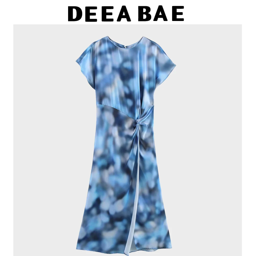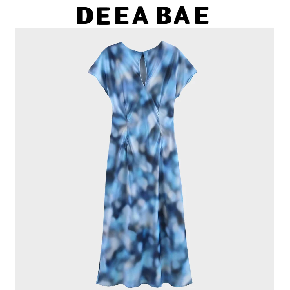 DEEABAE 2025 Spring New Product Women's Tie Dyeing Silk Texture Round Neck Midi Dress Printed Slimming Dress