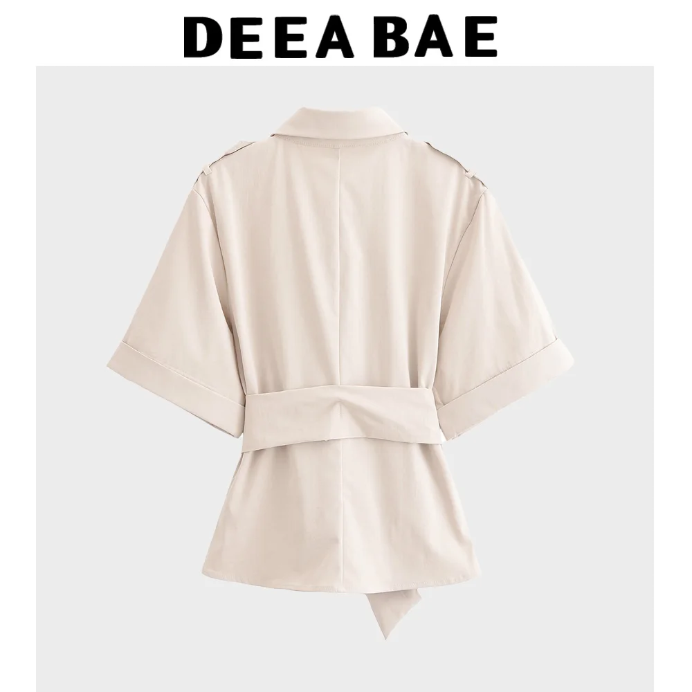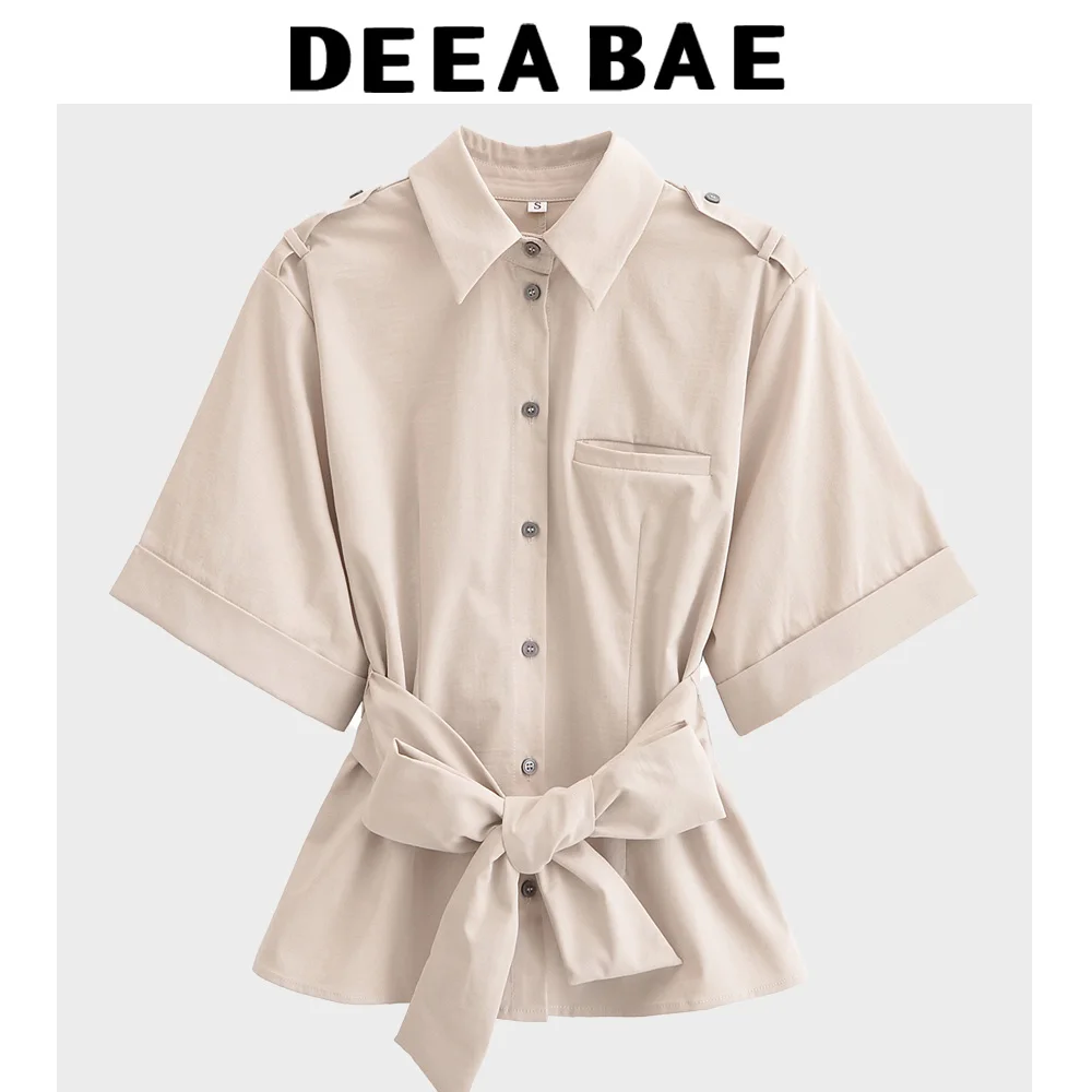 DEEABAE 2025 Spring New Product Women's Waist Belt Tripping Belt Decoration Curled Edge Short Sleeve Collar Shirt