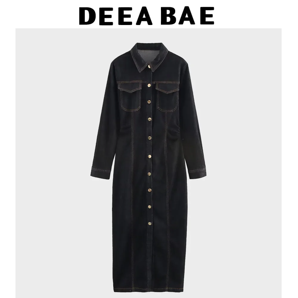 DEEABAE 2025 Spring New Simple And Versatile Single-breasted Denim Long-sleeved Lapel Midi Dress Women's Dresses Free Shipping