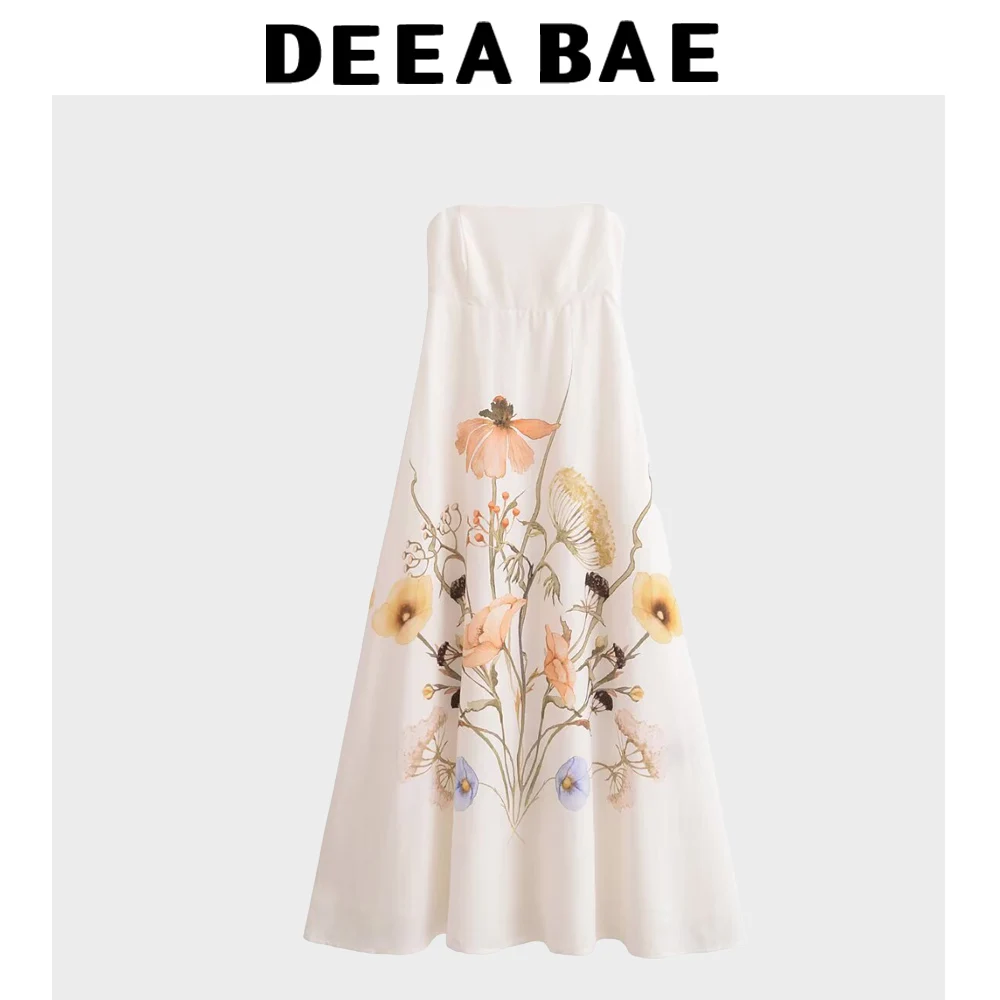 DEEABAE 2025 Spring New Women's Fashion Casual Versatile Linen Blended Strap Dress Flower Printed Holiday Skirt