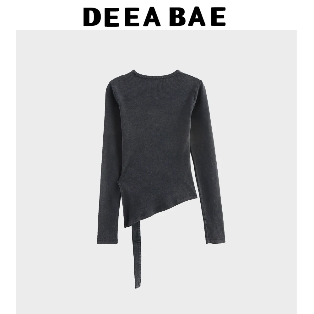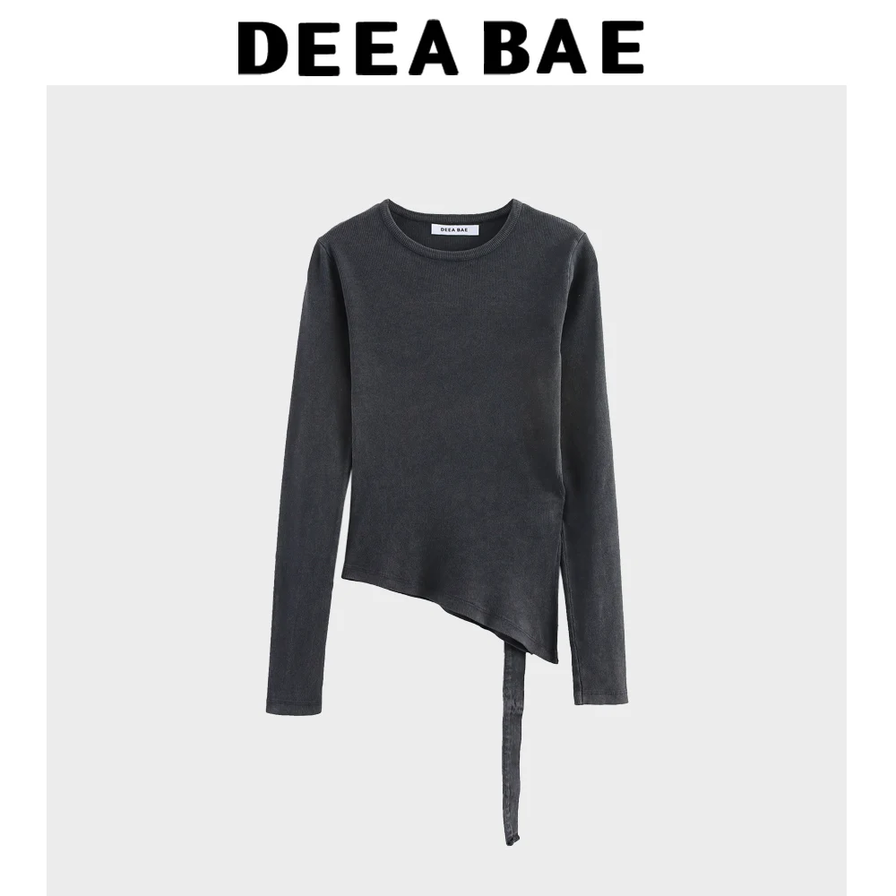 DEEABAE 2025 Spring New Women's Fashion Matching Belt Ribbed Diagonal Bottom Round Neck Long Sleeve T-shirt