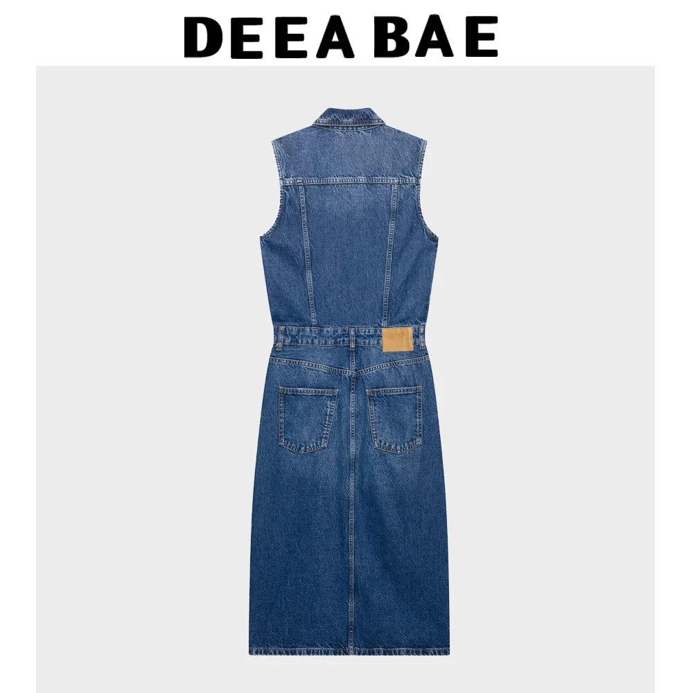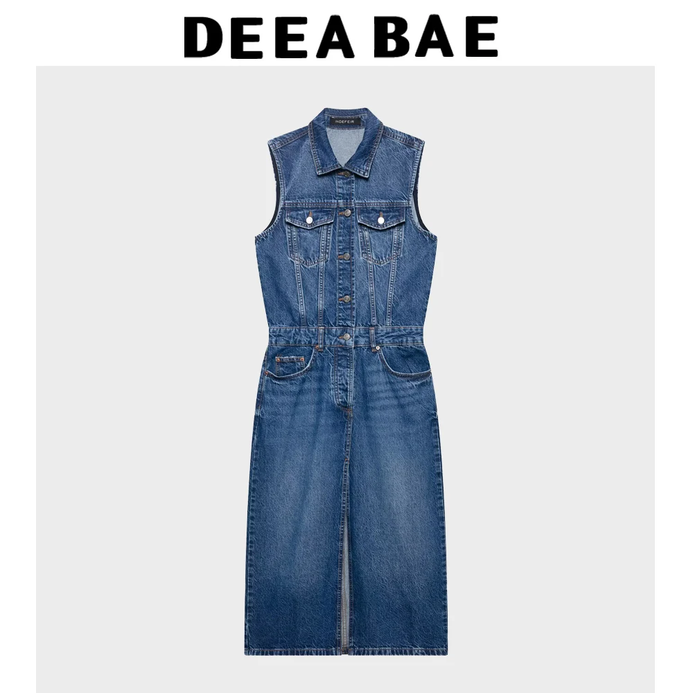 DEEABAE 2025 Spring/Summer New Women's Fashion Style Sleeveless Collar Front Split Cowboy Midi Dress