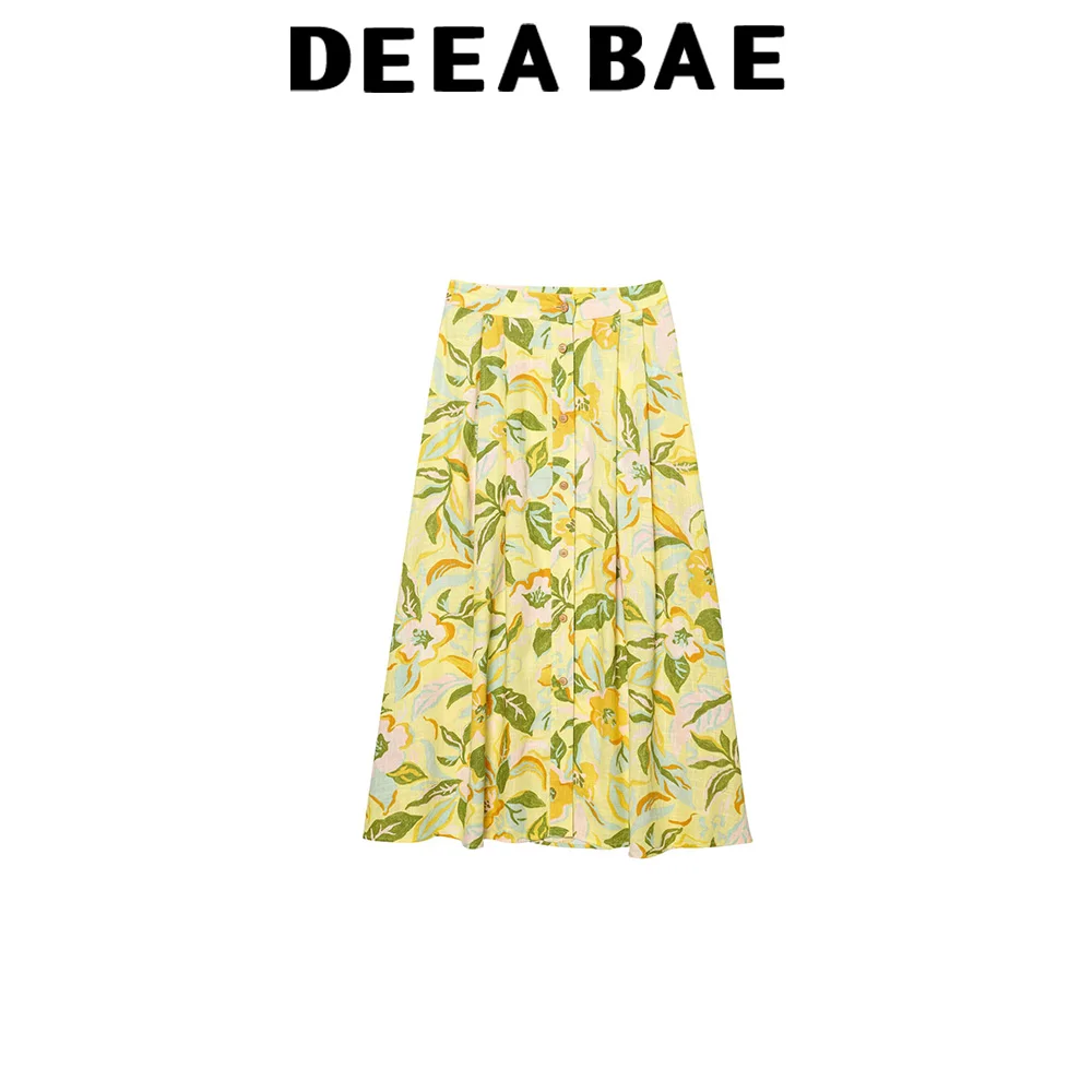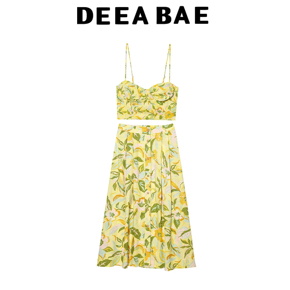 DEEABAE 2025 Summer New Style Linen Blended Comfortable Flower Printed Top Straight Tube High Waist Skirt Set