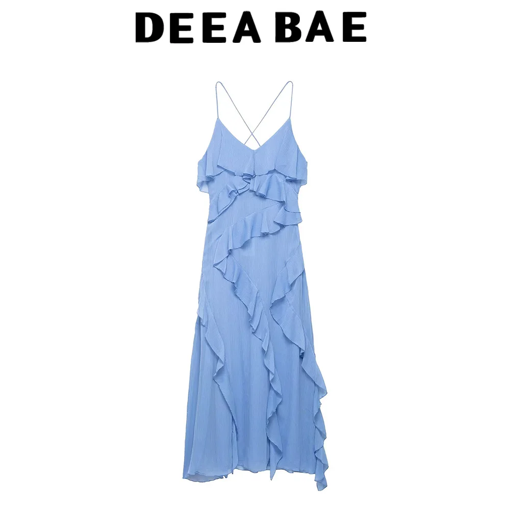 DEEABAE 2025 Summer New Sweet And Salty Temperament Sexy V-neck Layered Decorative Suspender Dress Long Style
