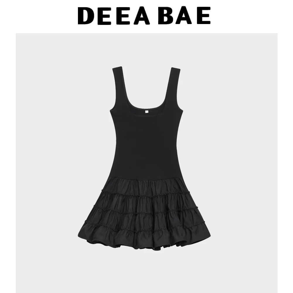 DEEABAE 2025 summer new women’s clothing waist cinching slimming fluffy patchwork square collar suspender dress