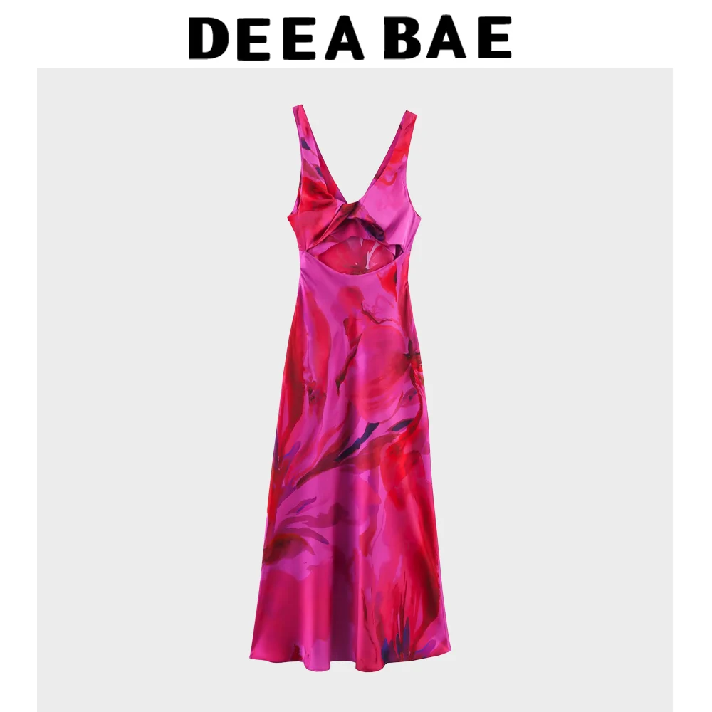 DEEABAE 2025 Summer New Women’s Fashion Charm Sweet Printed V-neck Silk Satin Texture Midi Dress