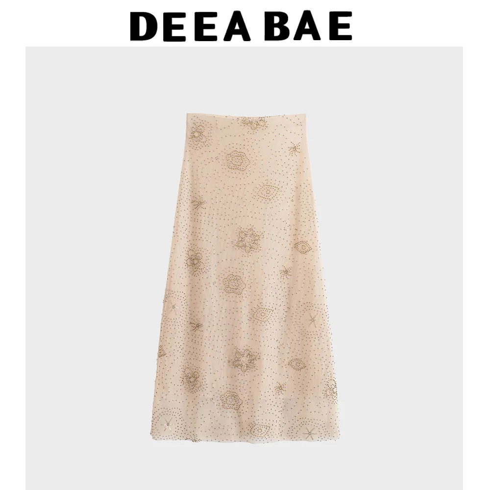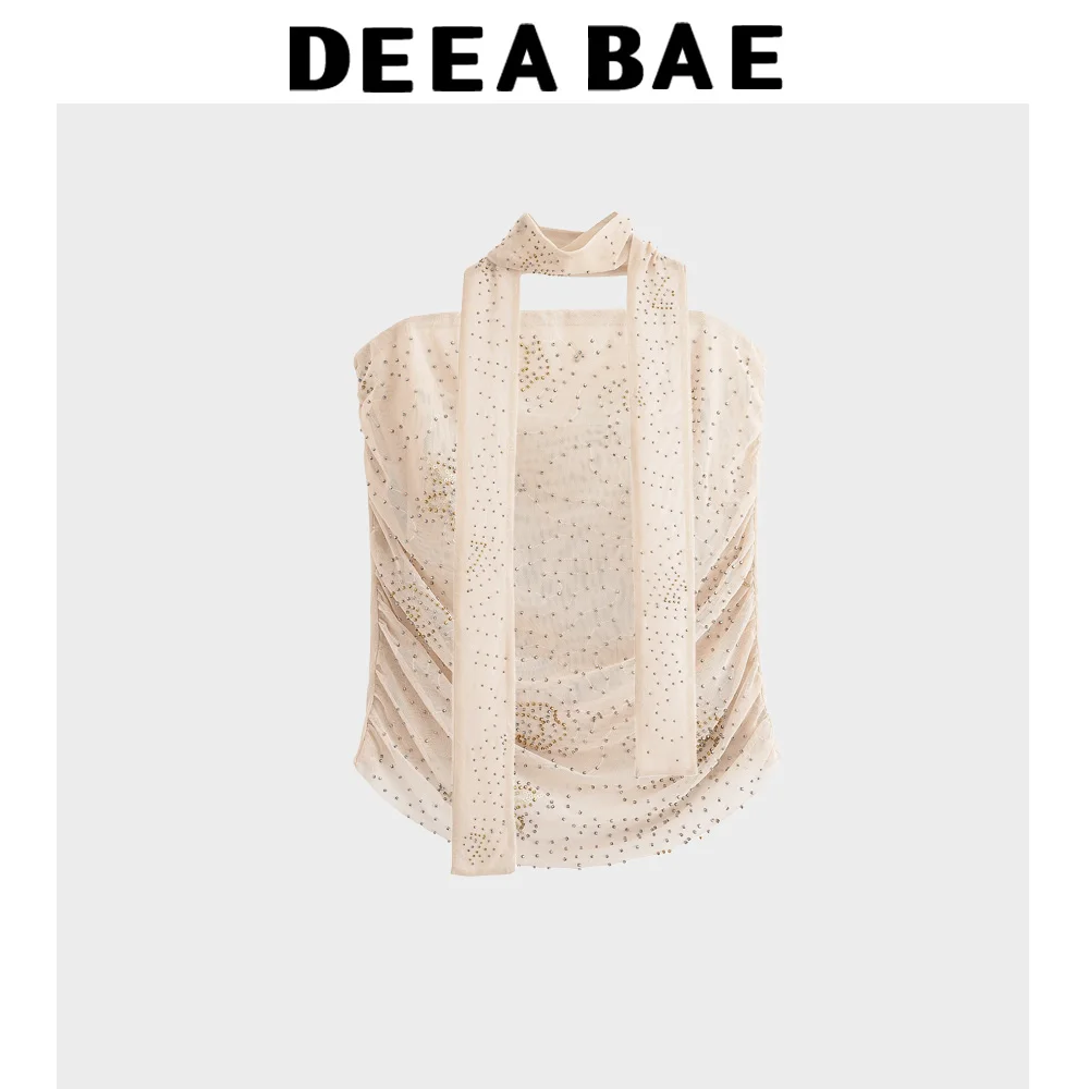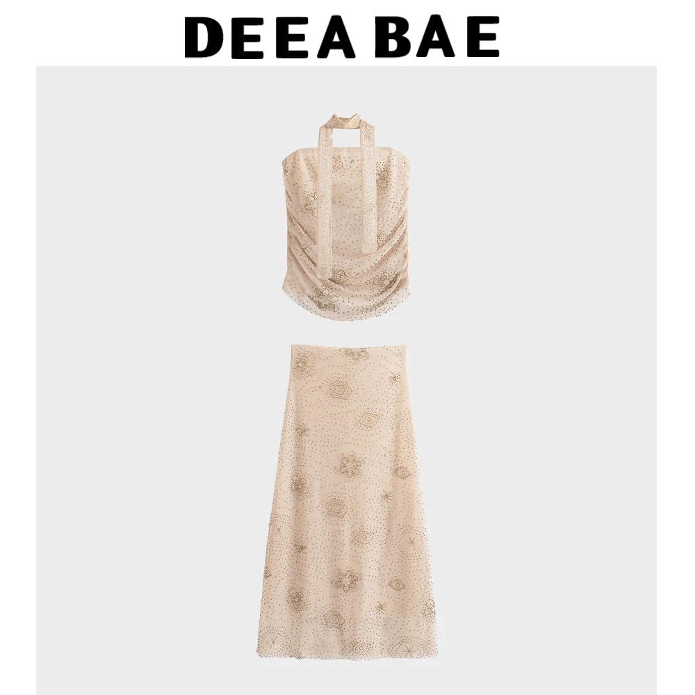 DEEABAE 2025 Summer New Women's Fashion Style Scarf Collar Beaded Top Casual Western Style Mesh Half Skirt Set