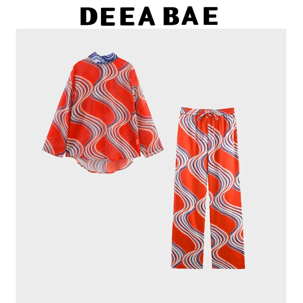 DEEABAE 2025 Summer New Women's Fashion Style Simple Printed Shirt Printed Pajama Style Pants Set