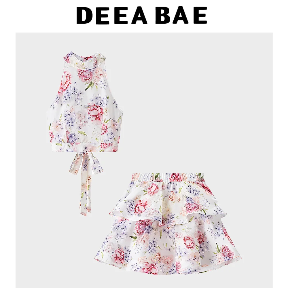 DEEABAE 2025 summer new women’s fashion temperament hanging neck sleeveless short top short floral skirt two-piece set